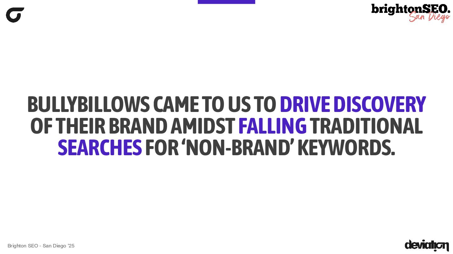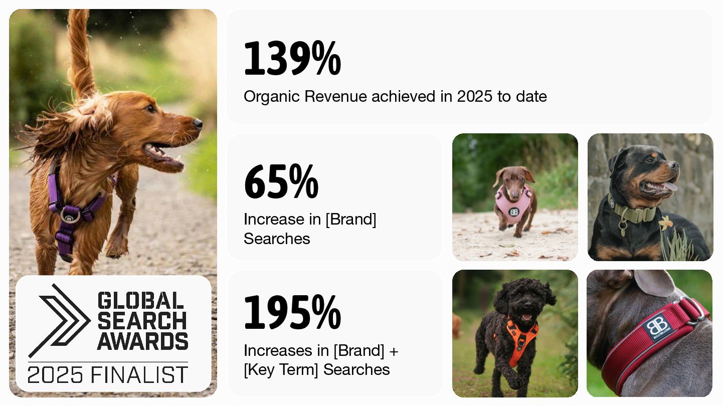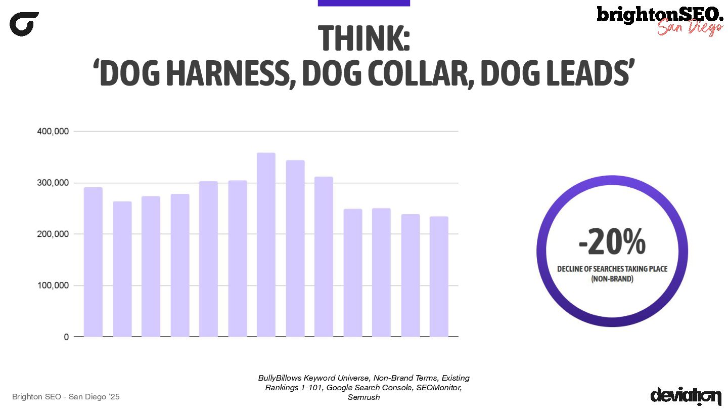 BullyBillows, a dog accessories brand, faced falling non-brand keyword searches like dog harness and dog collar. Instead of asking “are searches reducing?”, we asked “where are they migrating?”.