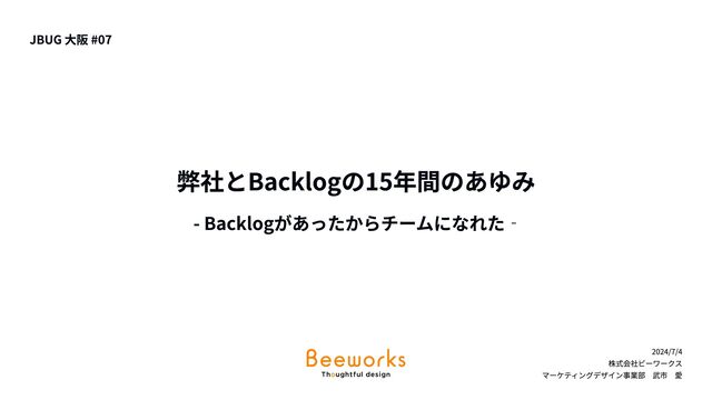 2024/7/4 株式会社ビーワークス マーケティングデザイン事業部 武市 愛 JBUG 大阪 #07 弊社とBacklogの15年間のあゆみ - Backlogがあったからチームになれた‐