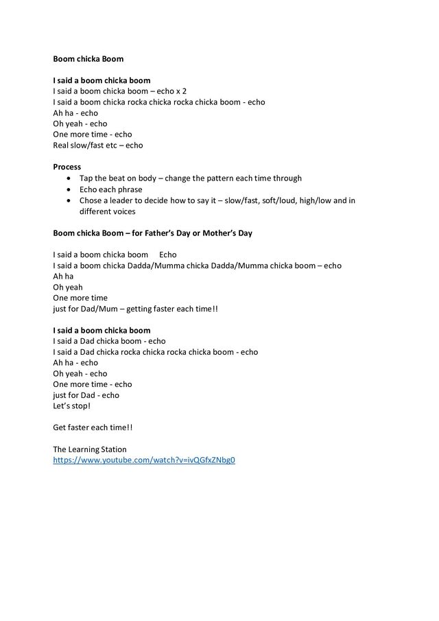 said a boom chicka boom – echo x 2 I said a boom chicka rocka chicka rocka chicka boom - echo Ah ha - echo Oh yeah - echo One more time - echo Real slow/fast etc – echo Process • Tap the beat on body – change the pattern each time through • Echo each phrase • Chose a leader to decide how to say it – slow/fast, soft/loud, high/low and in different voices Boom chicka Boom – for Father’s Day or Mother’s Day I said a boom chicka boom Echo I said a boom chicka Dadda/Mumma chicka Dadda/Mumma chicka boom – echo Ah ha Oh yeah One more time just for Dad/Mum – getting faster each time!! I said a boom chicka boom I said a Dad chicka boom - echo I said a Dad chicka rocka chicka rocka chicka boom - echo Ah ha - echo Oh yeah - echo One more time - echo just for Dad - echo Let’s stop! Get faster each time!! The Learning Station https://www.youtube.com/watch?v=ivQGfxZNbg0