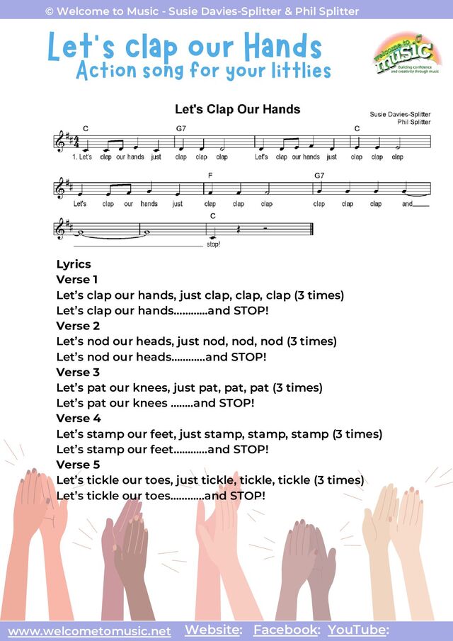 littlies www.welcometomusic.net Website: Facebook: YouTube: © Welcome to Music - Susie Davies-Splitter & Phil Splitter Lyrics Verse 1 Let’s clap our hands, just clap, clap, clap (3 times) Let’s clap our hands…………and STOP! Verse 2 Let’s nod our heads, just nod, nod, nod (3 times) Let’s nod our heads…………and STOP! Verse 3 Let’s pat our knees, just pat, pat, pat (3 times) Let’s pat our knees ……..and STOP! Verse 4 Let’s stamp our feet, just stamp, stamp, stamp (3 times) Let’s stamp our feet…………and STOP! Verse 5 Let’s tickle our toes, just tickle, tickle, tickle (3 times) Let’s tickle our toes…………and STOP!