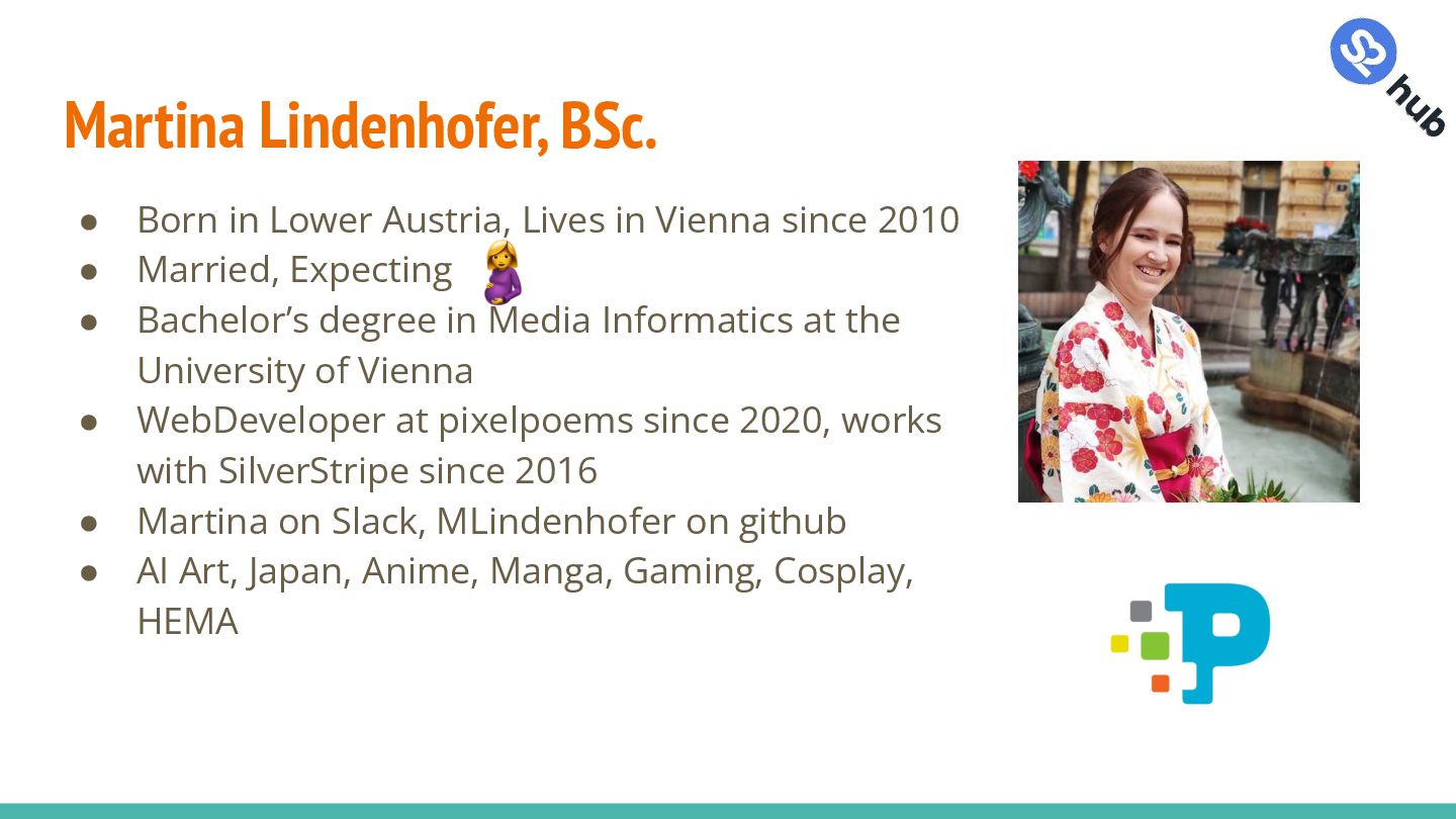 Vienna since 2010 • Married, Expecting • Bachelor’s degree in Media Informatics at the University of Vienna • WebDeveloper at pixelpoems since 2020, works with SilverStripe since 2016 • Martina on Slack, MLindenhofer on github • AI Art, Japan, Anime, Manga, Gaming, Cosplay, HEMA