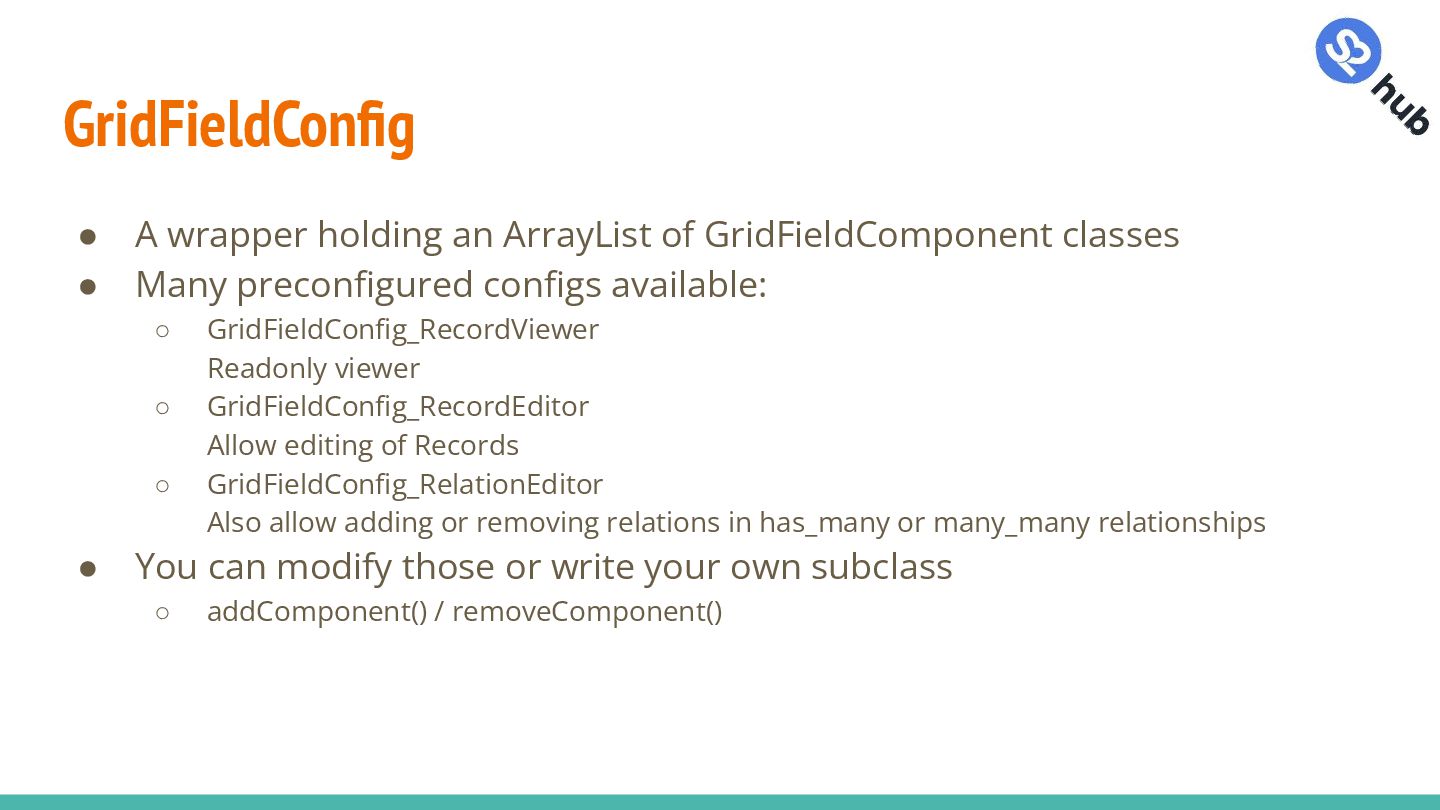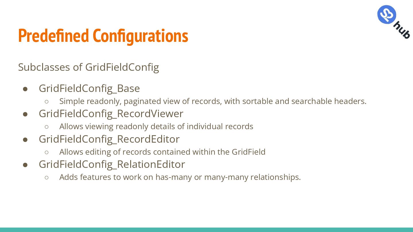 • Many preconfigured configs available: ◦ GridFieldConfig_RecordViewer Readonly viewer ◦ GridFieldConfig_RecordEditor Allow editing of Records ◦ GridFieldConfig_RelationEditor Also allow adding or removing relations in has_many or many_many relationships • You can modify those or write your own subclass ◦ addComponent() / removeComponent()
