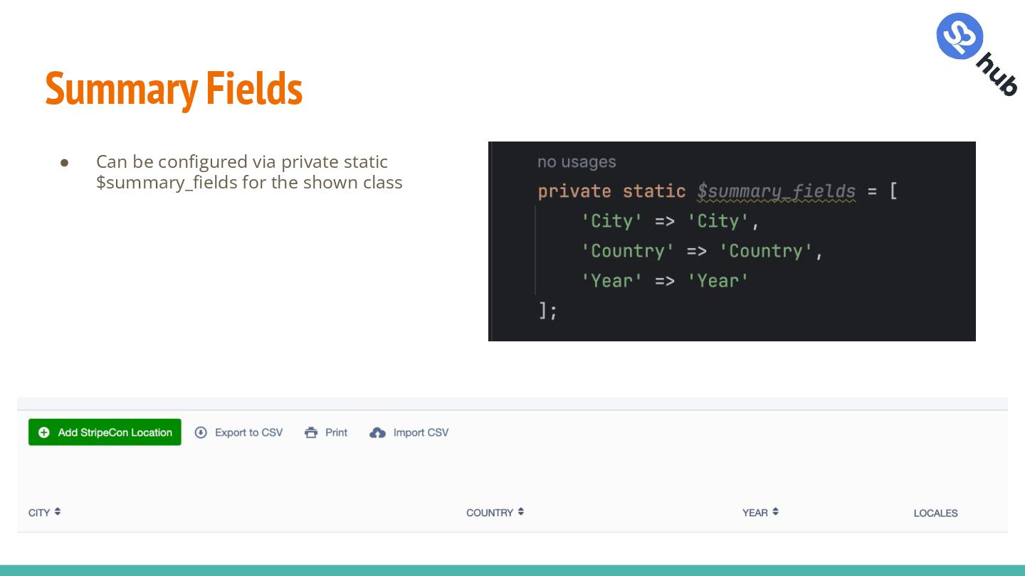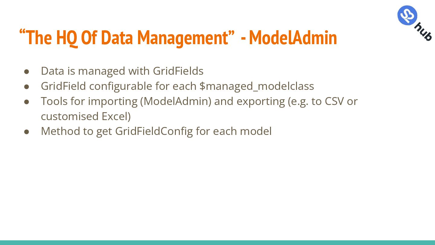 managed with GridFields • GridField configurable for each $managed_modelclass • Tools for importing (ModelAdmin) and exporting (e.g. to CSV or customised Excel) • Method to get GridFieldConfig for each model
