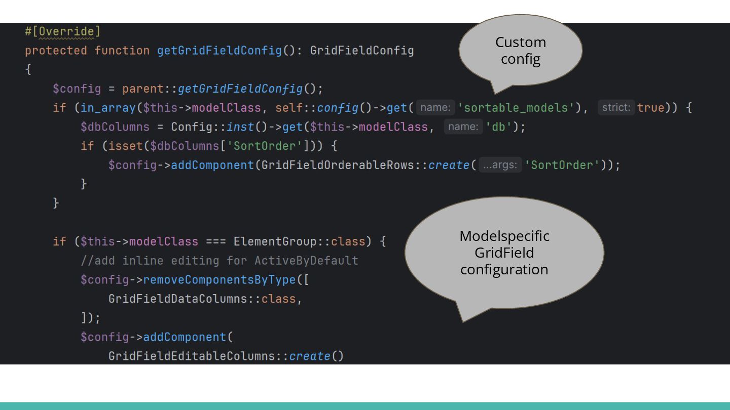 • Use it in an Extension • Example: add sorting to all GridFields, where the items have a “Sort” or “SortOrder” field
