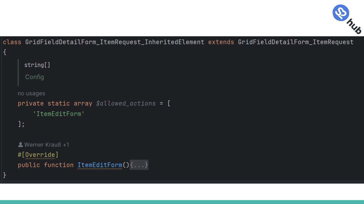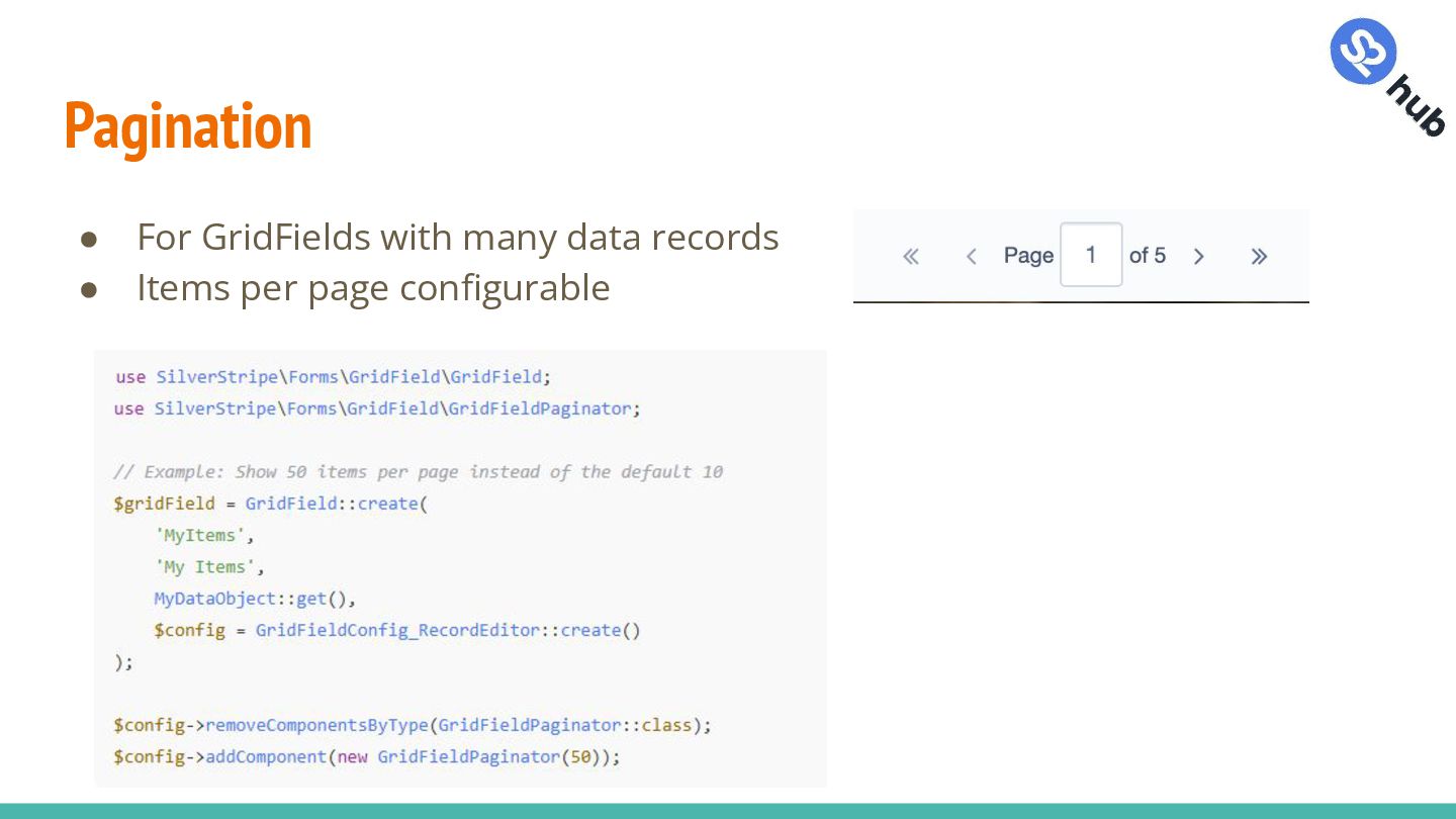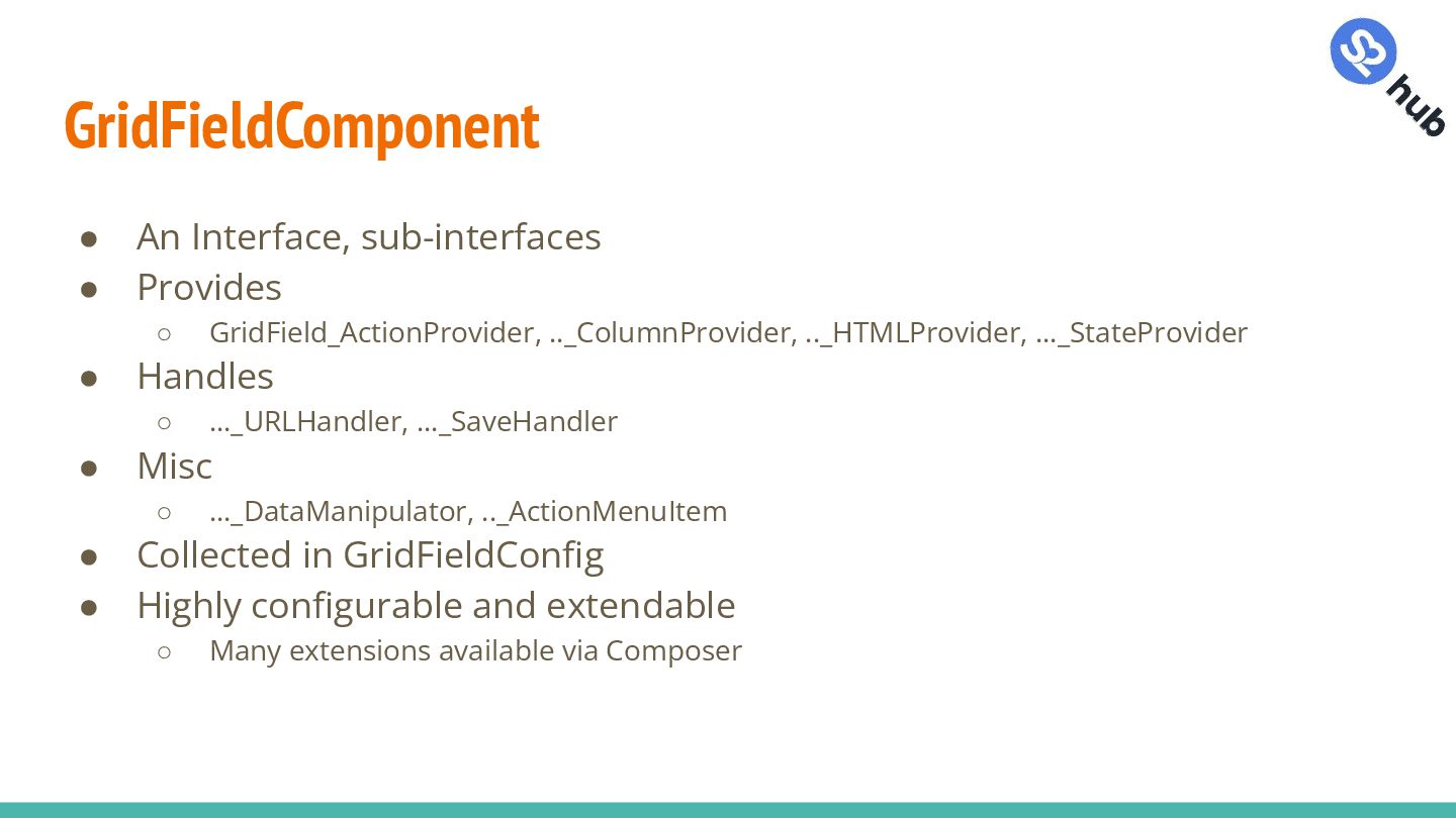.._HTMLProvider, …_StateProvider • Handles ◦ …_URLHandler, …_SaveHandler • Misc ◦ …_DataManipulator, .._ActionMenuItem • Collected in GridFieldConfig • Highly configurable and extendable ◦ Many extensions available via Composer