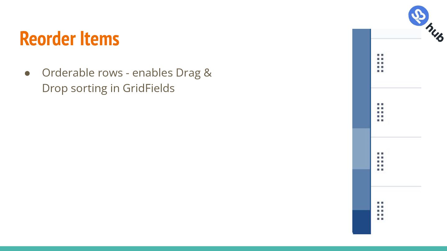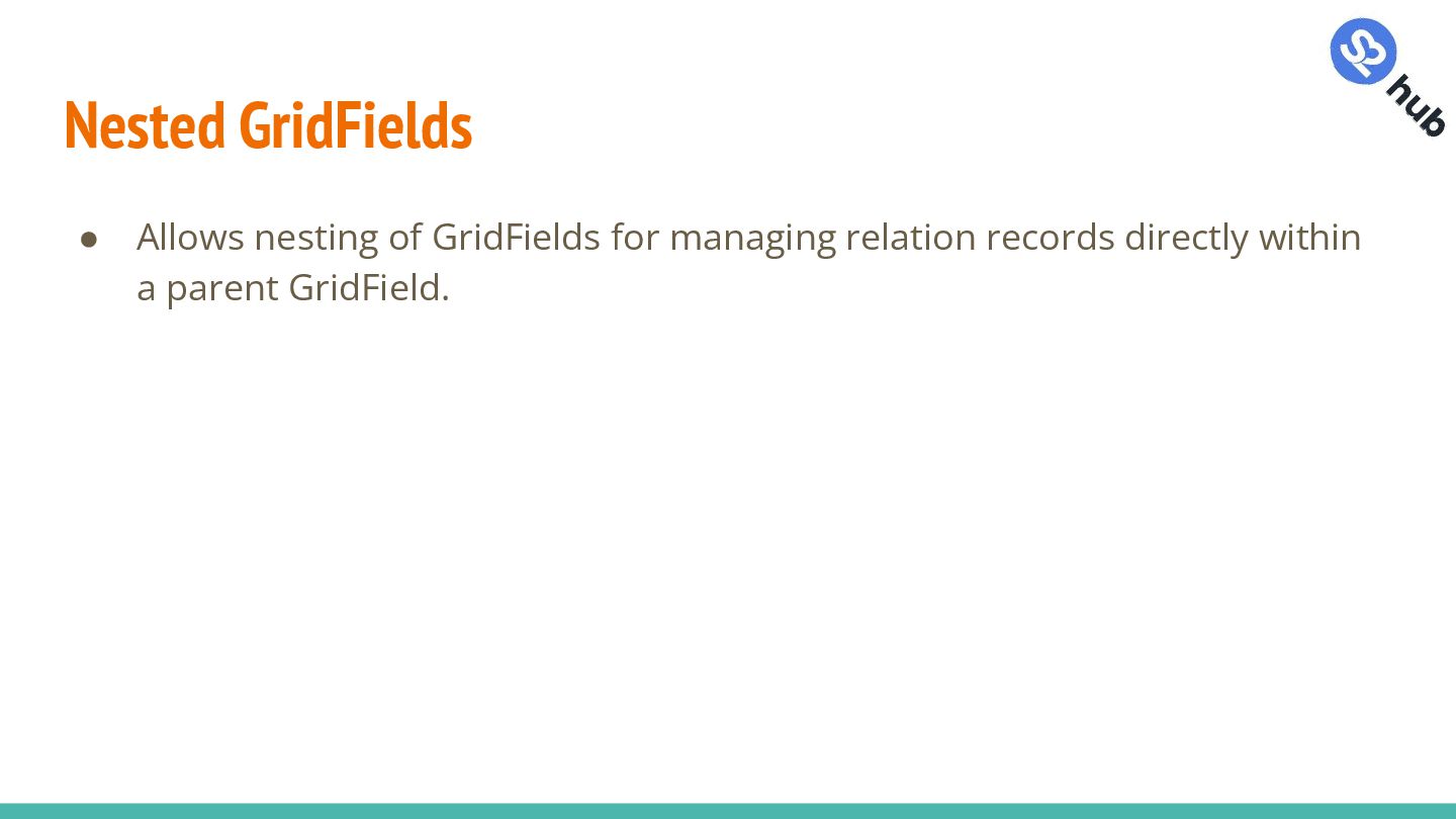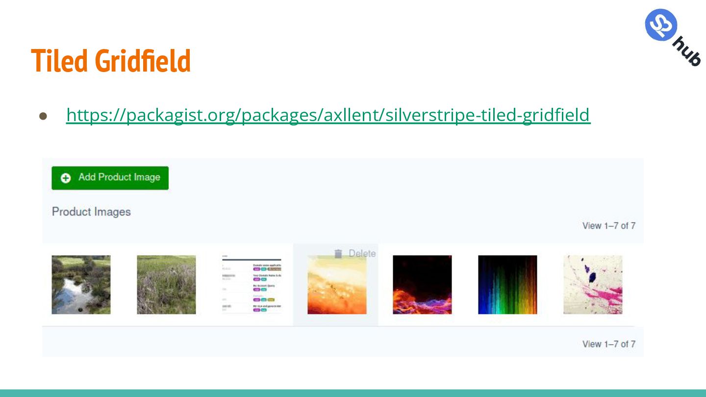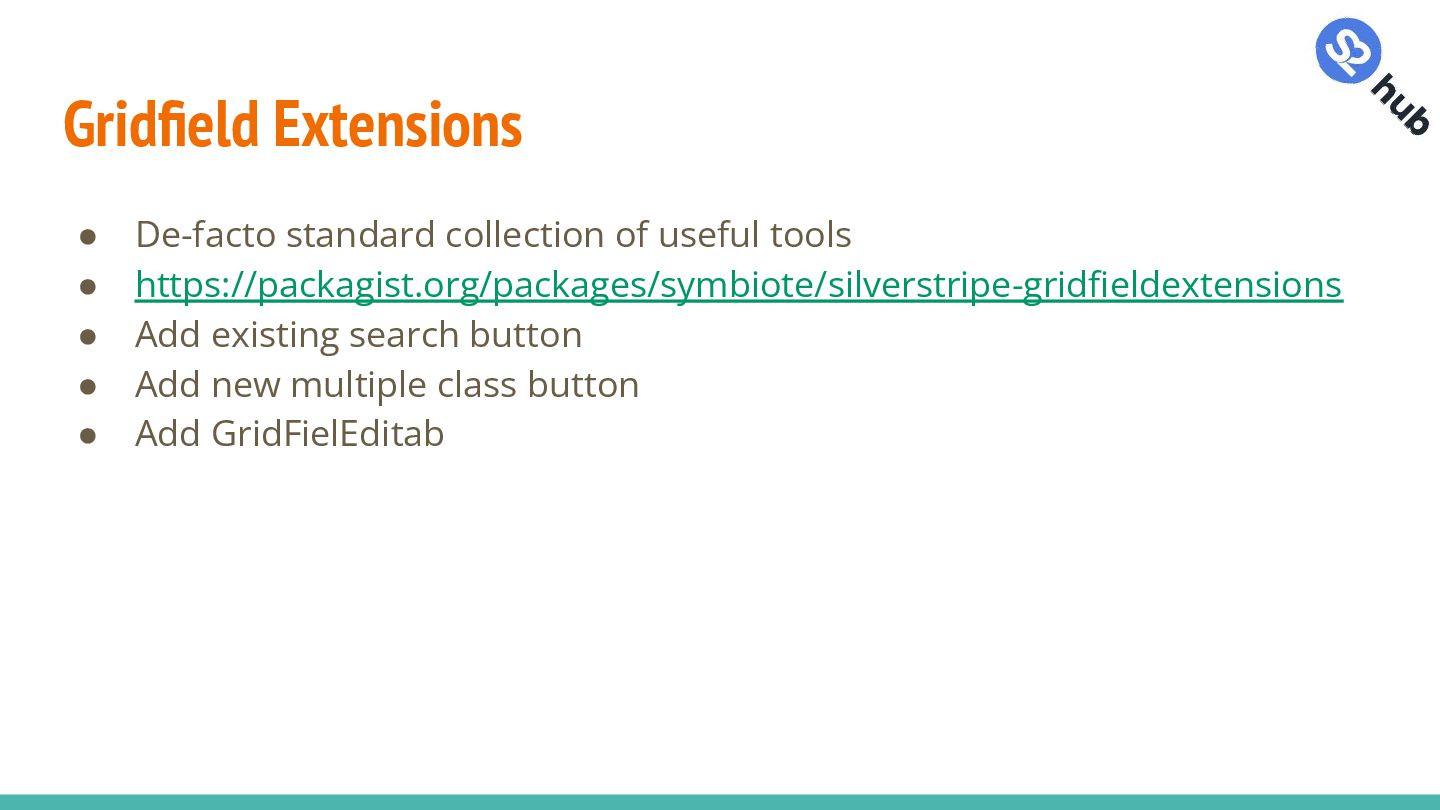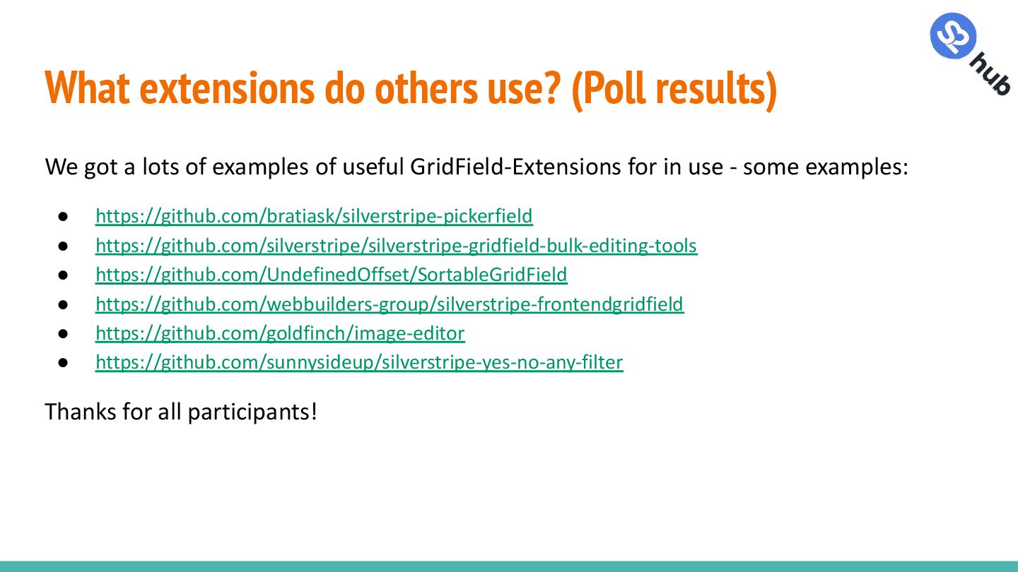lots of examples of useful GridField-Extensions for in use - some examples: • https://github.com/bratiask/silverstripe-pickerfield • https://github.com/silverstripe/silverstripe-gridfield-bulk-editing-tools • https://github.com/UndefinedOffset/SortableGridField • https://github.com/webbuilders-group/silverstripe-frontendgridfield • https://github.com/goldfinch/image-editor • https://github.com/sunnysideup/silverstripe-yes-no-any-filter Thanks for all participants!