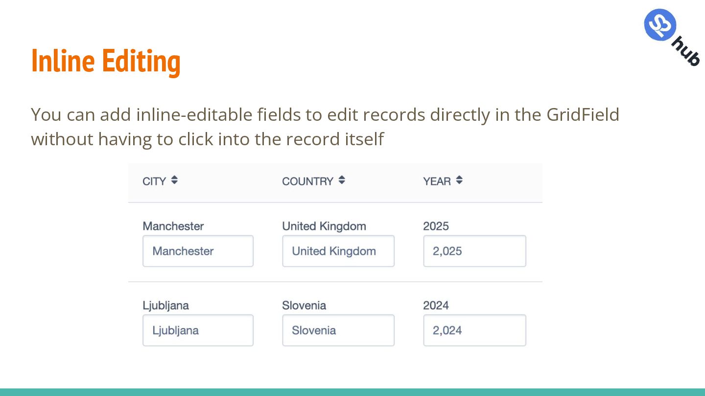 paginated view of records, with sortable and searchable headers. • GridFieldConfig_RecordViewer ◦ Allows viewing readonly details of individual records • GridFieldConfig_RecordEditor ◦ Allows editing of records contained within the GridField • GridFieldConfig_RelationEditor ◦ Adds features to work on has-many or many-many relationships.