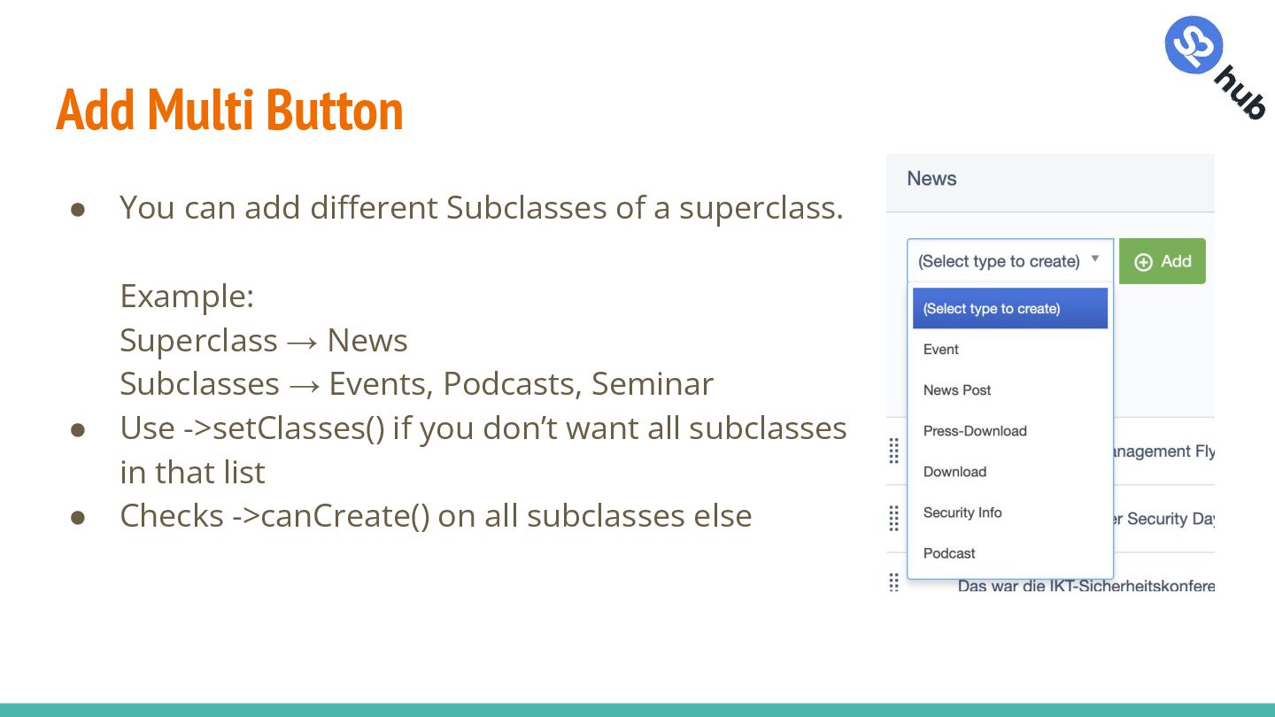 a superclass. Example: Superclass → News Subclasses → Events, Podcasts, Seminar • Use ->setClasses() if you don’t want all subclasses in that list • Checks ->canCreate() on all subclasses else