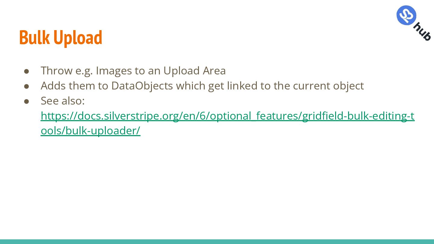 • Adds them to DataObjects which get linked to the current object • See also: https://docs.silverstripe.org/en/6/optional_features/gridfield-bulk-editing-t ools/bulk-uploader/
