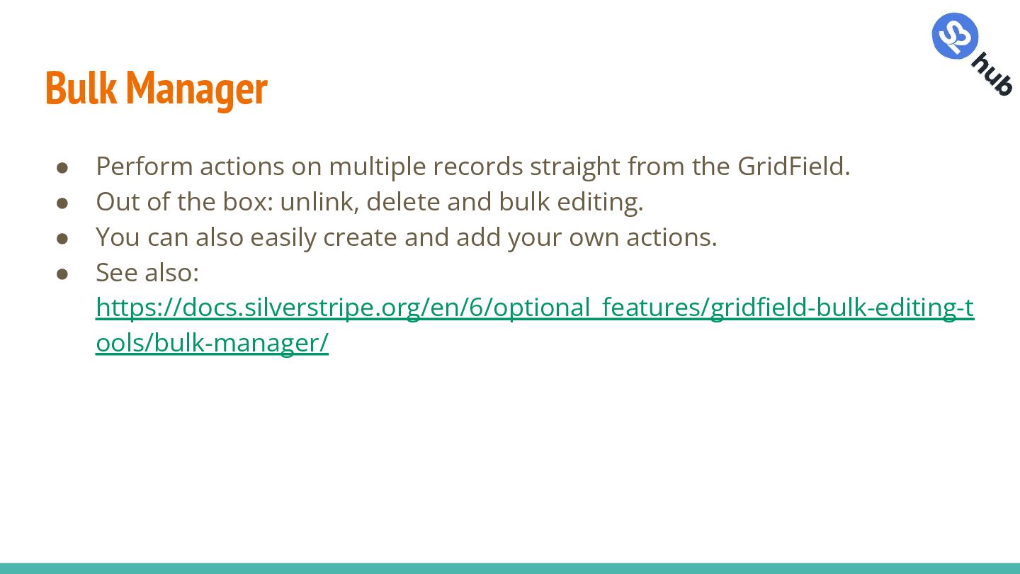 the GridField. • Out of the box: unlink, delete and bulk editing. • You can also easily create and add your own actions. • See also: https://docs.silverstripe.org/en/6/optional_features/gridfield-bulk-editing-t ools/bulk-manager/