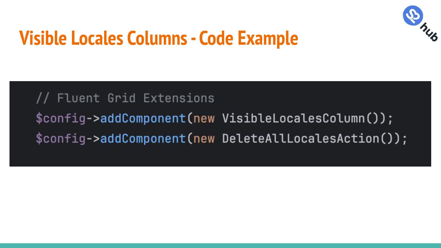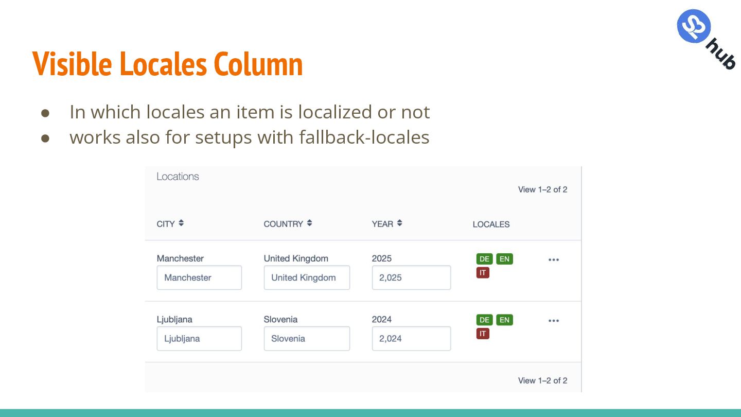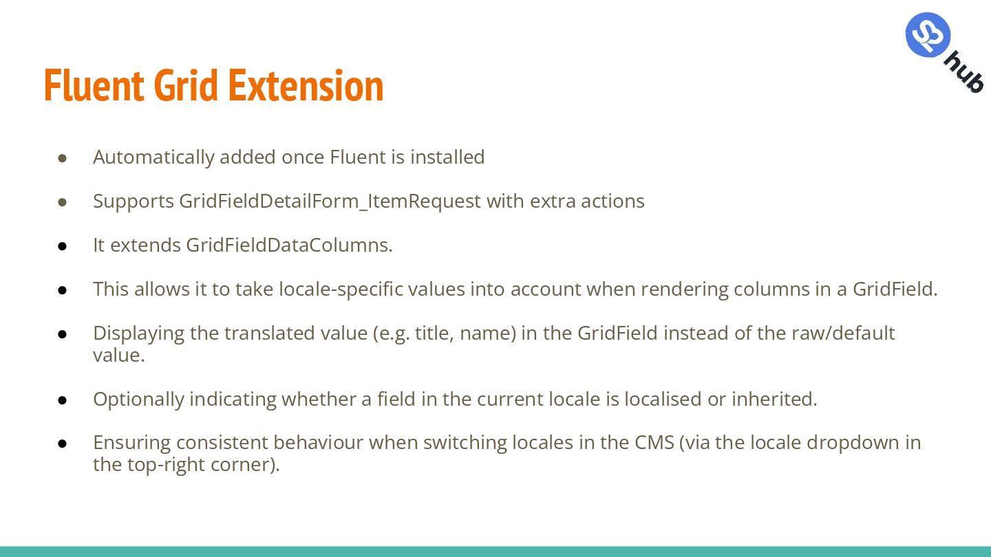 • Supports GridFieldDetailForm_ItemRequest with extra actions • It extends GridFieldDataColumns. • This allows it to take locale-specific values into account when rendering columns in a GridField. • Displaying the translated value (e.g. title, name) in the GridField instead of the raw/default value. • Optionally indicating whether a field in the current locale is localised or inherited. • Ensuring consistent behaviour when switching locales in the CMS (via the locale dropdown in the top-right corner).