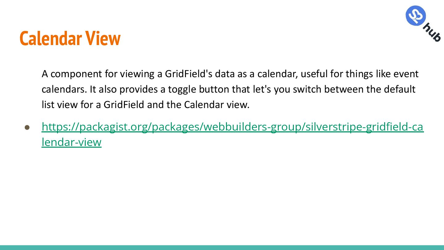 a calendar, useful for things like event calendars. It also provides a toggle button that let's you switch between the default list view for a GridField and the Calendar view. • https://packagist.org/packages/webbuilders-group/silverstripe-gridfield-ca lendar-view