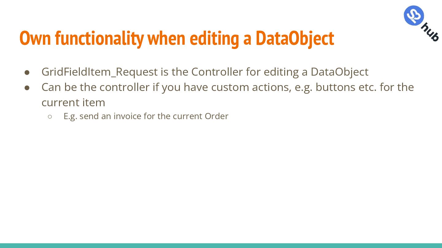 Controller for editing a DataObject • Can be the controller if you have custom actions, e.g. buttons etc. for the current item ◦ E.g. send an invoice for the current Order