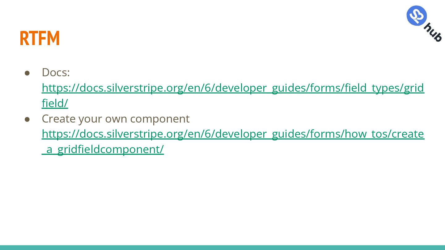 23. RTFM • Docs: https://docs.silverstripe.org/en/6/developer_guides/forms/field_types/grid field/ • Create your own component
