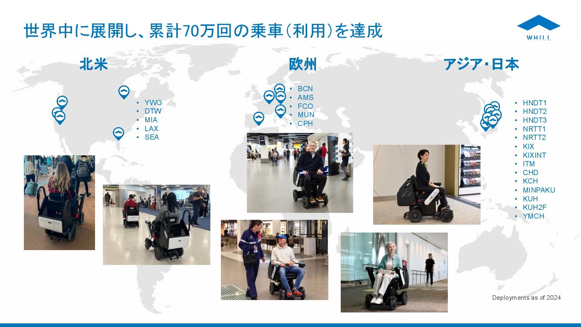• KIX • KIXINT • ITM • CHD • KCH • MINPAKU • KUH • KUH2F • YMCH • YWG • DTW • MIA • LAX • SEA • BCN • AMS • FCO • MUN • CPH Deployments as of 2024 北米 欧州 アジア・日本 世界中に展開し、累計70万回の乗車(利用)を達成