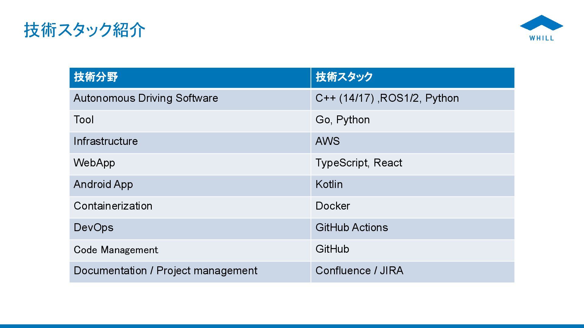 技術スタック紹介 技術分野 技術スタック Autonomous Driving Software C++ (14/17) ,ROS1/2, Python
