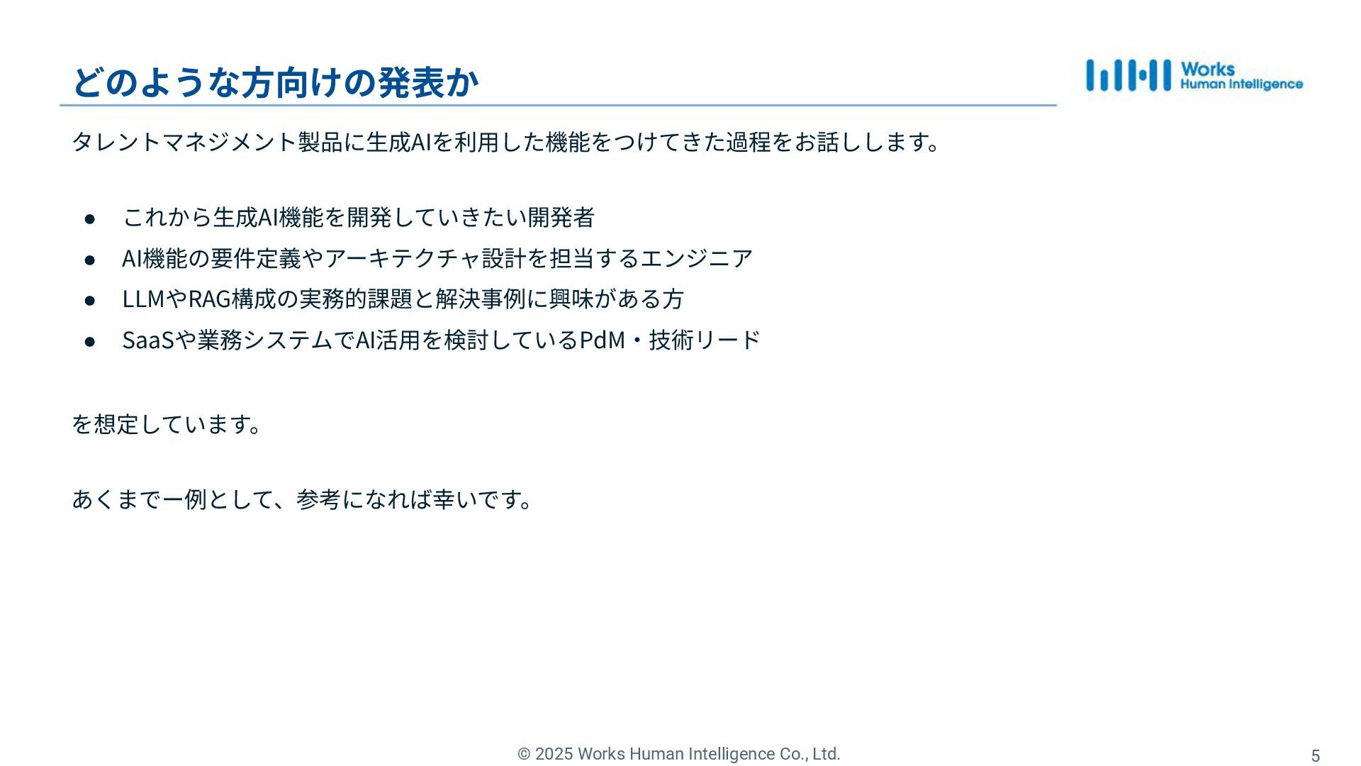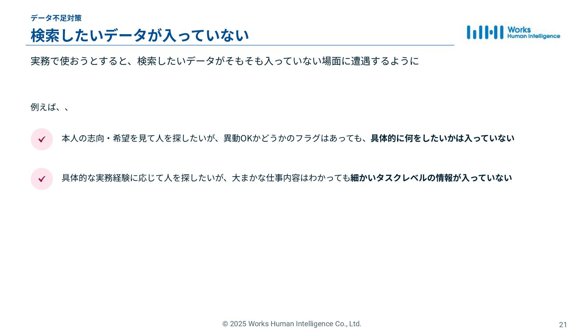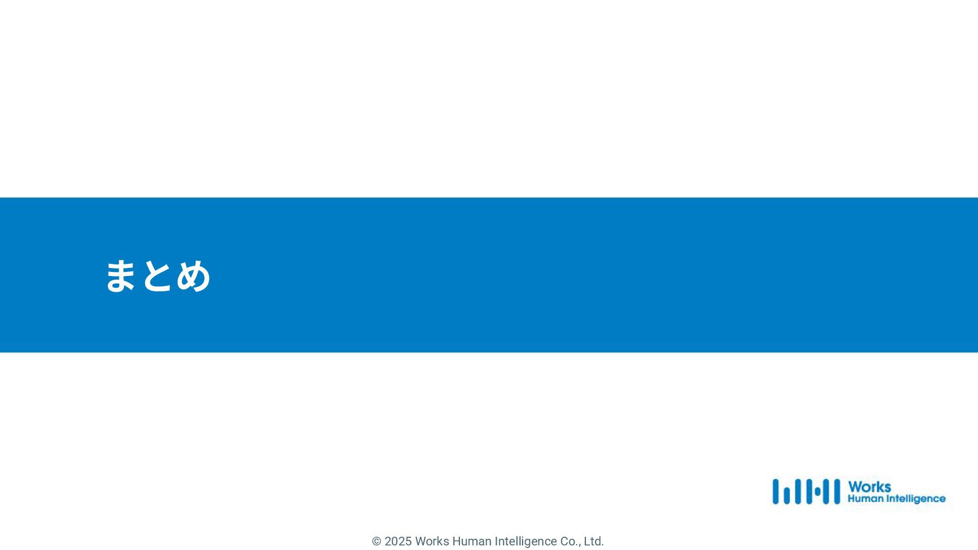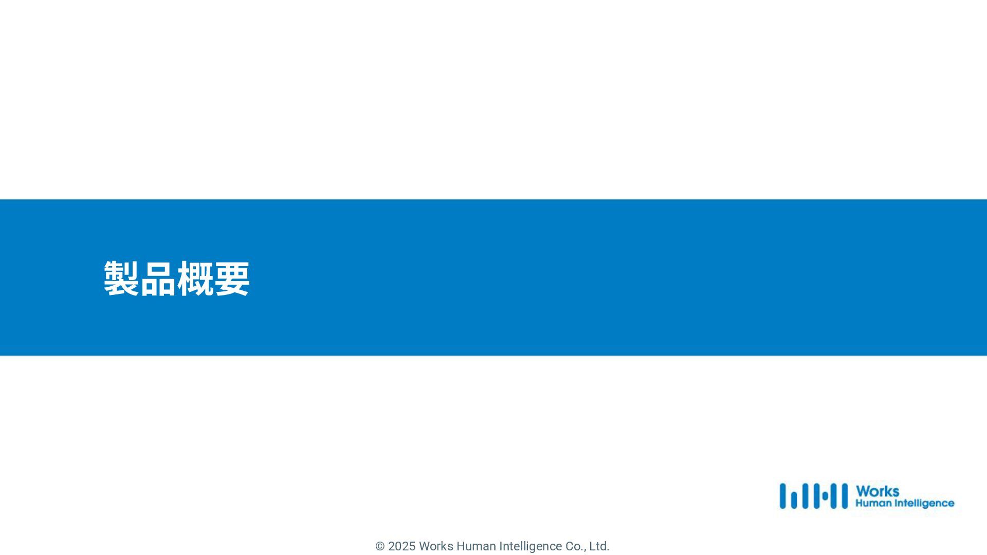 Intelligenceについて ※1 2022年度 ERP市場 - ⼈事‧給与業務分野:ベンダー別売上⾦額シェア 出典:ITR「ITR Market View:ERP市場2024」 ※2 従業員数3,000⼈以上の法⼈ ※3 当社調べ ※4 2024年12⽉末時点の契約法⼈における「COMPANY ⼈事」の契約ライセンス数合計 ⼈事‧給与業務分野 シェアNo.1※1 国内⼤⼿法⼈※2の 3社に1社※3が利⽤ 管理データ数 540万⼈※4 ソリューション 今後の戦略 会社概要 会社名 事業内容 設⽴年 従業員数 株式会社Works Human Intelligence ⼤⼿企業向け統合⼈事システム「COMPANY」の 開発‧販売‧サポート、HR関連サービスの提供 2019年8⽉1⽇ 2,198名(連結)※ ※2024年12⽉末時点 AI‧データ活⽤のための新部⾨設⽴ ⼈的資本マネジメント強化 前代未聞の⼤規模クラウドシフト WHIエンジニアの魅⼒ フルスタック開発 豊富な学習機会 ⼤規模なERP開発