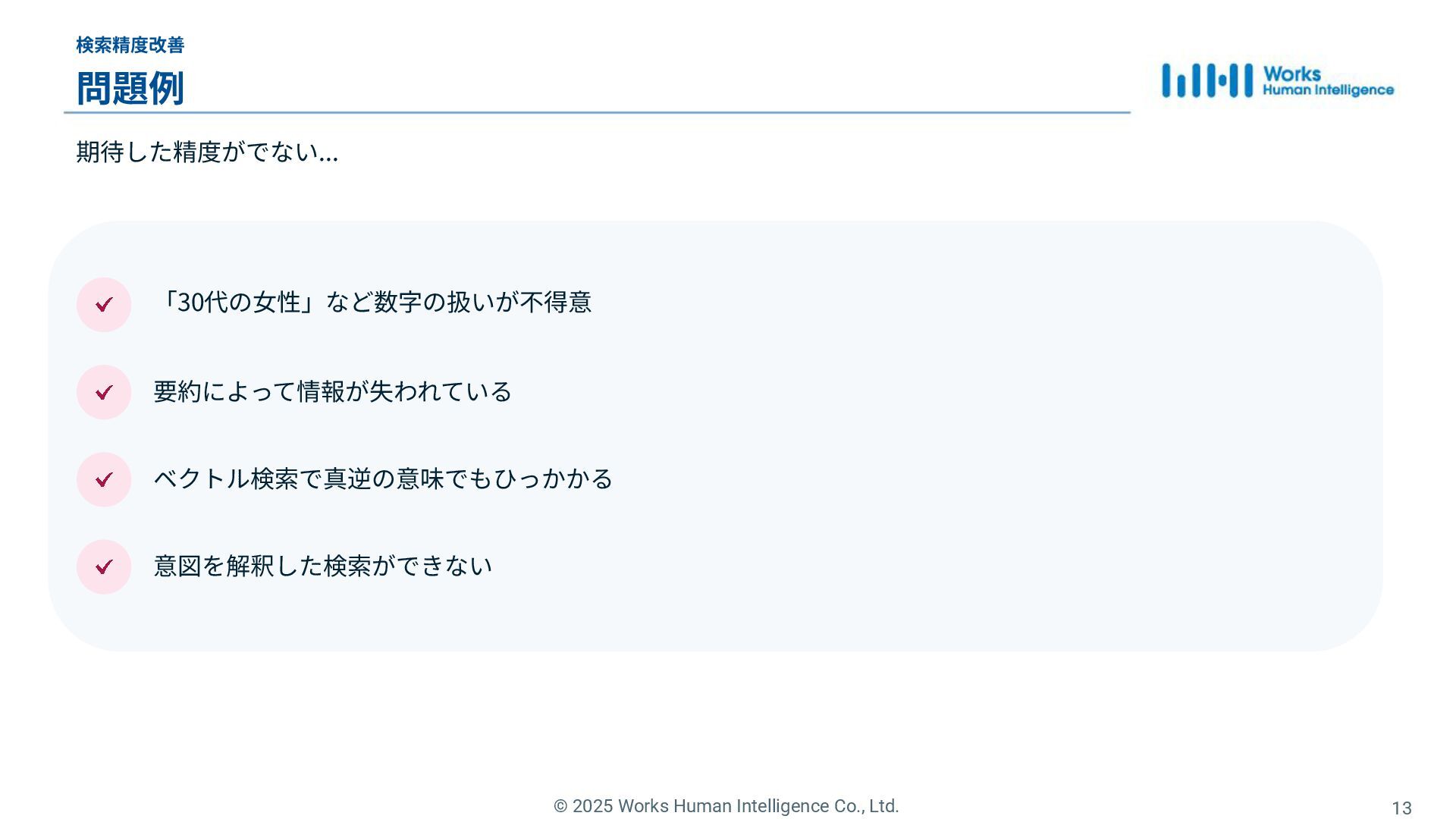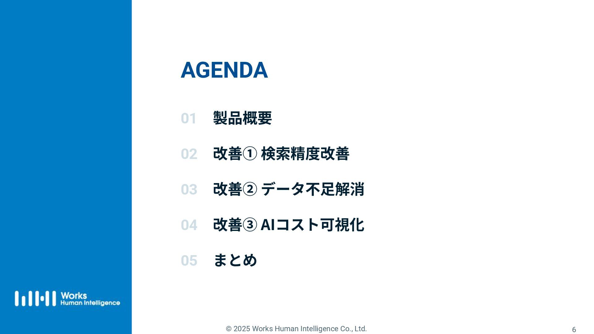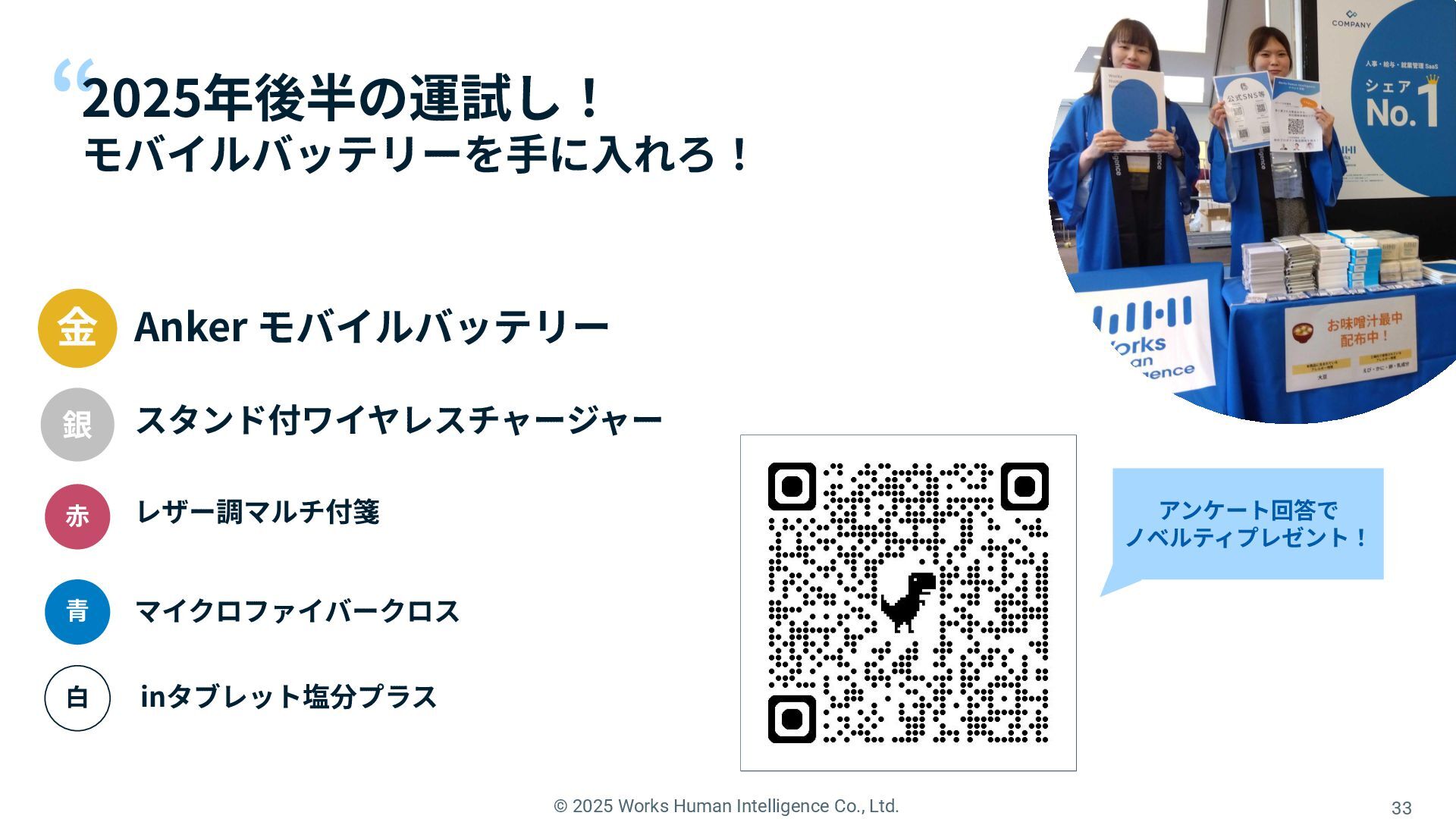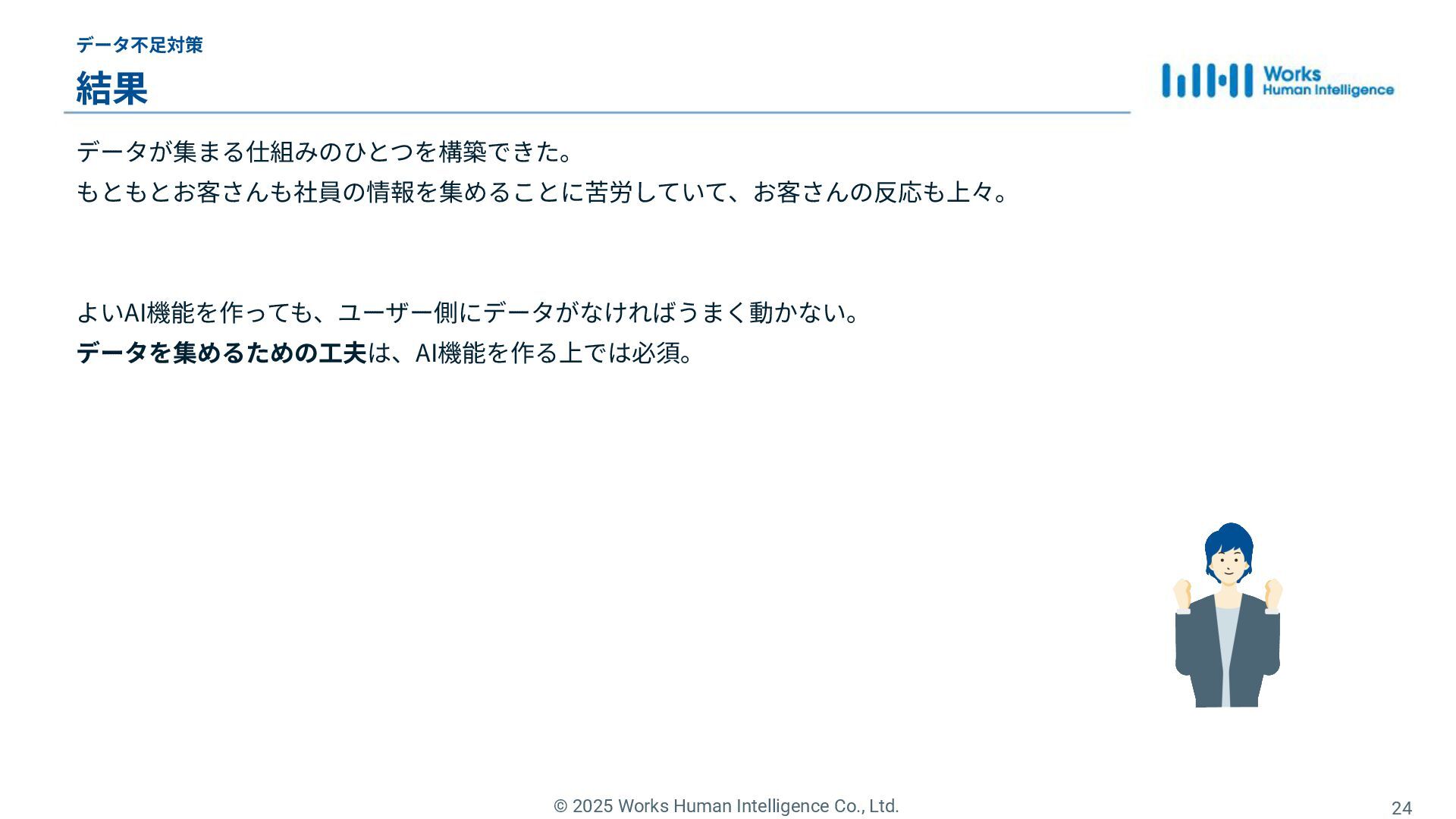 Intelligenceについて ※1 2022年度 ERP市場 - ⼈事‧給与業務分野:ベンダー別売上⾦額シェア 出典:ITR「ITR Market View:ERP市場2024」 ※2 従業員数3,000⼈以上の法⼈ ※3 当社調べ ※4 2024年12⽉末時点の契約法⼈における「COMPANY ⼈事」の契約ライセンス数合計 ⼈事‧給与業務分野 シェアNo.1※1 国内⼤⼿法⼈※2の 3社に1社※3が利⽤ 管理データ数 540万⼈※4 ソリューション 今後の戦略 会社概要 会社名 事業内容 設⽴年 従業員数 株式会社Works Human Intelligence ⼤⼿企業向け統合⼈事システム「COMPANY」の 開発‧販売‧サポート、HR関連サービスの提供 2019年8⽉1⽇ 2,198名(連結)※ ※2024年12⽉末時点 AI‧データ活⽤のための新部⾨設⽴ ⼈的資本マネジメント強化 前代未聞の⼤規模クラウドシフト WHIエンジニアの魅⼒ フルスタック開発 豊富な学習機会 ⼤規模なERP開発