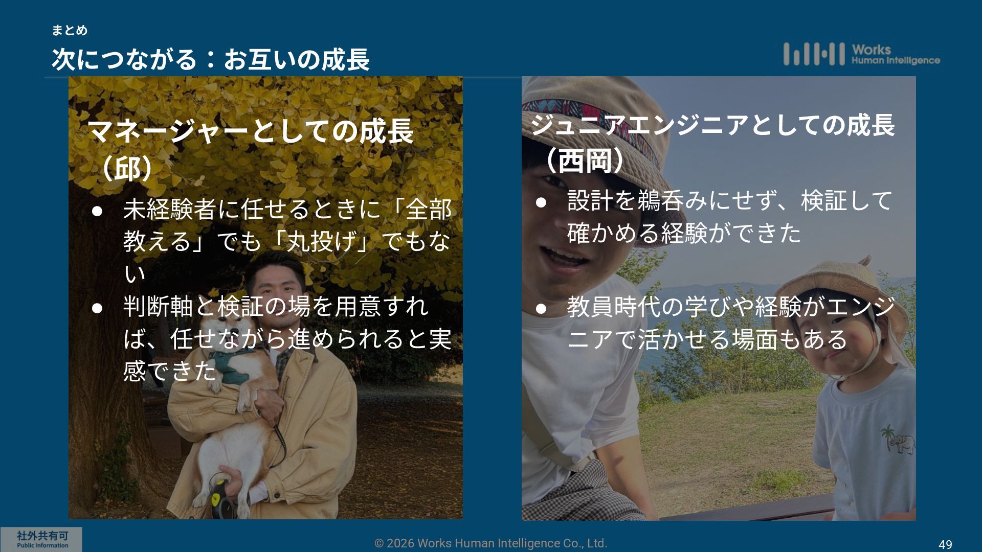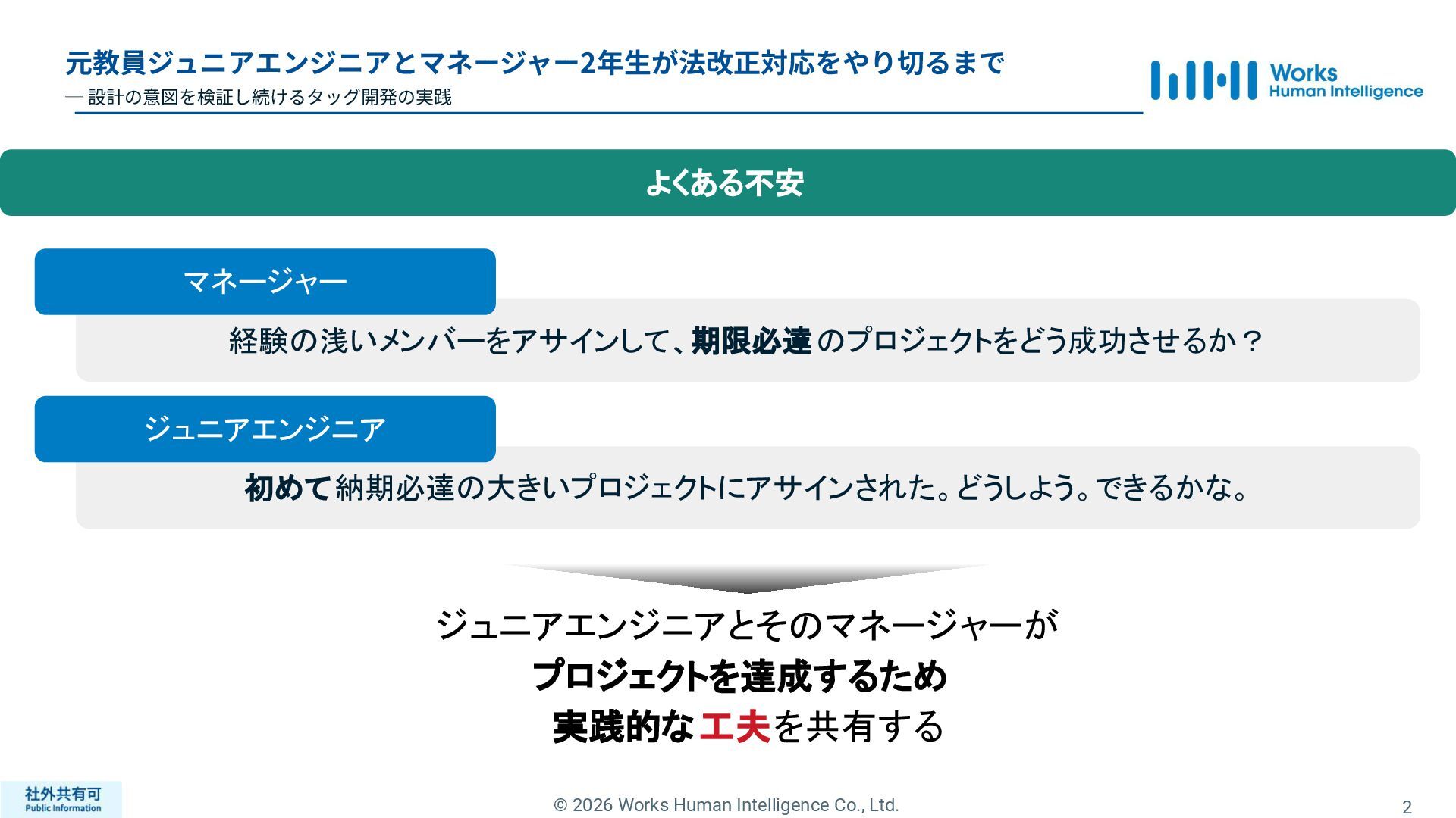 © 2026 Works Human Intelligence Co., Ltd. ジュニアエンジニアとそのマネージャーが プロジェクトを達成するため 実践的な工夫を共有する
