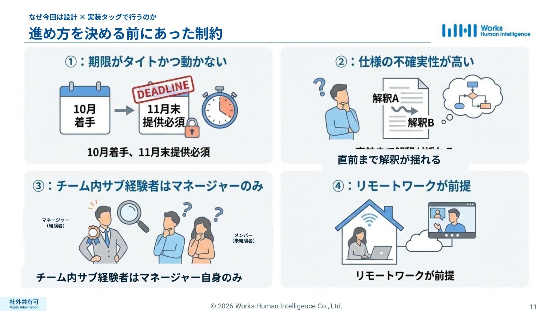 © 2026 Works Human Intelligence Co., Ltd. 11 進め⽅を決める前にあった制約 なぜ今回は設計