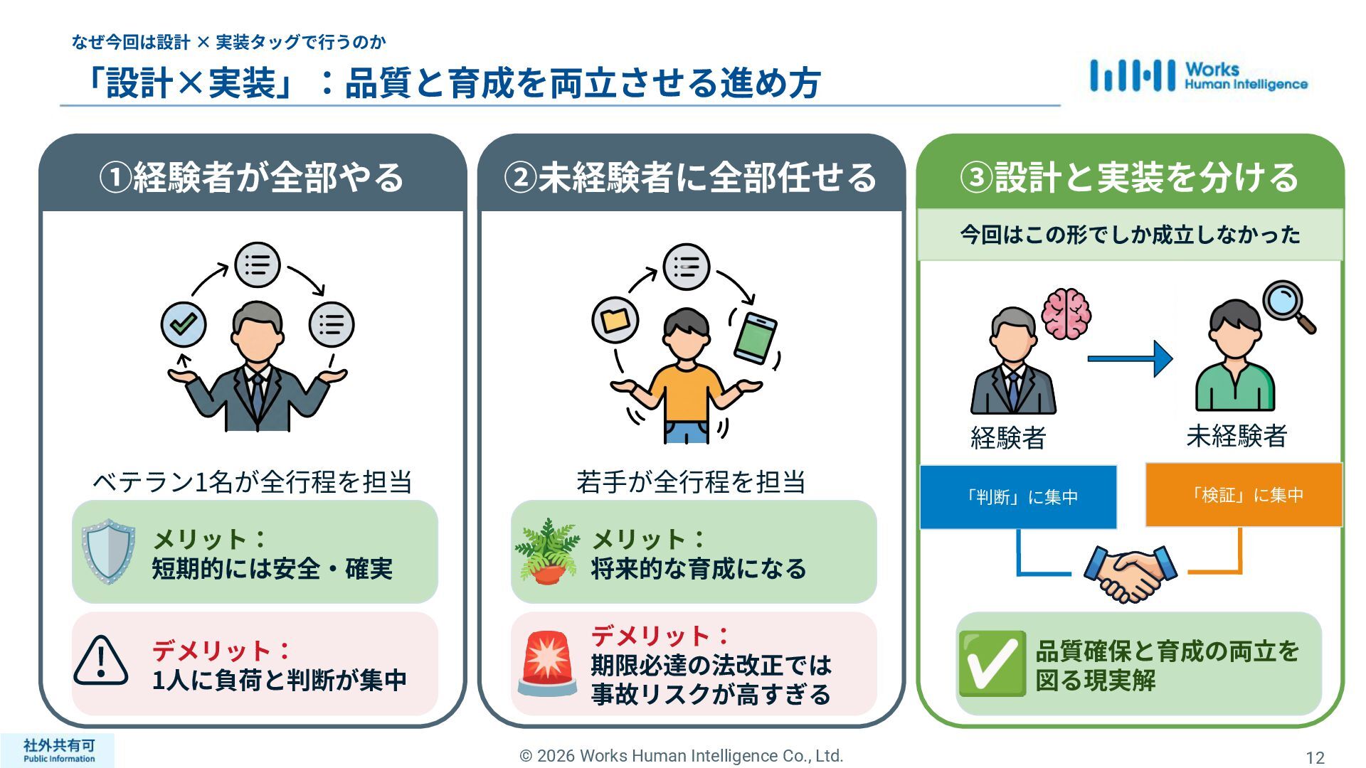 © 2026 Works Human Intelligence Co., Ltd. 12 「設計×実装」:品質と育成を両⽴させる進め⽅ なぜ今回は設計