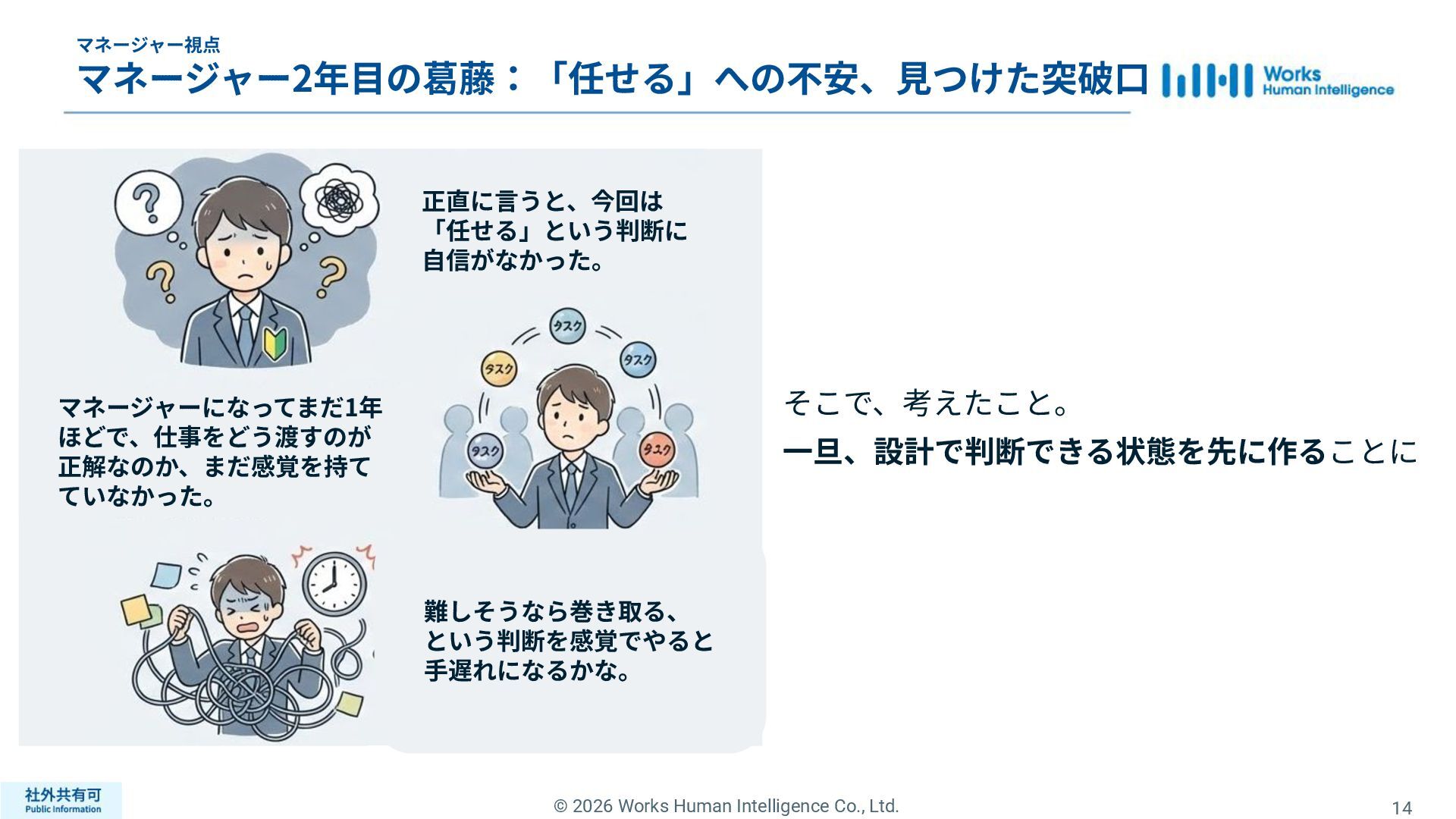 © 2026 Works Human Intelligence Co., Ltd. 14 マネージャー2年⽬の葛藤:「任せる」への不安、⾒つけた突破⼝ マネージャー視点