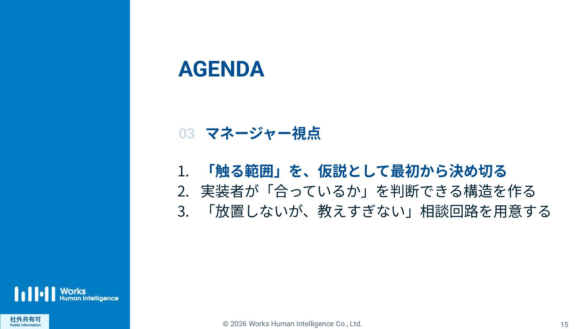 © 2026 Works Human Intelligence Co., Ltd. AGENDA 15 03 マネージャー視点