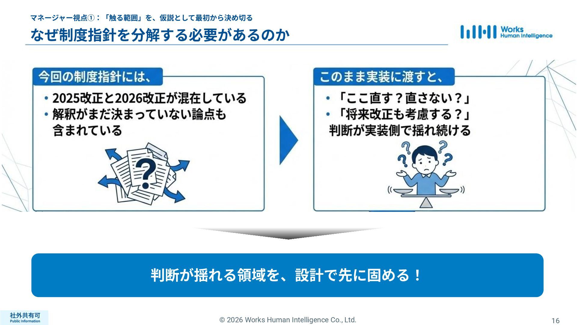 © 2026 Works Human Intelligence Co., Ltd. 16 なぜ制度指針を分解する必要があるのか マネージャー視点①:「触る範囲」を、仮説として最初から決め切る