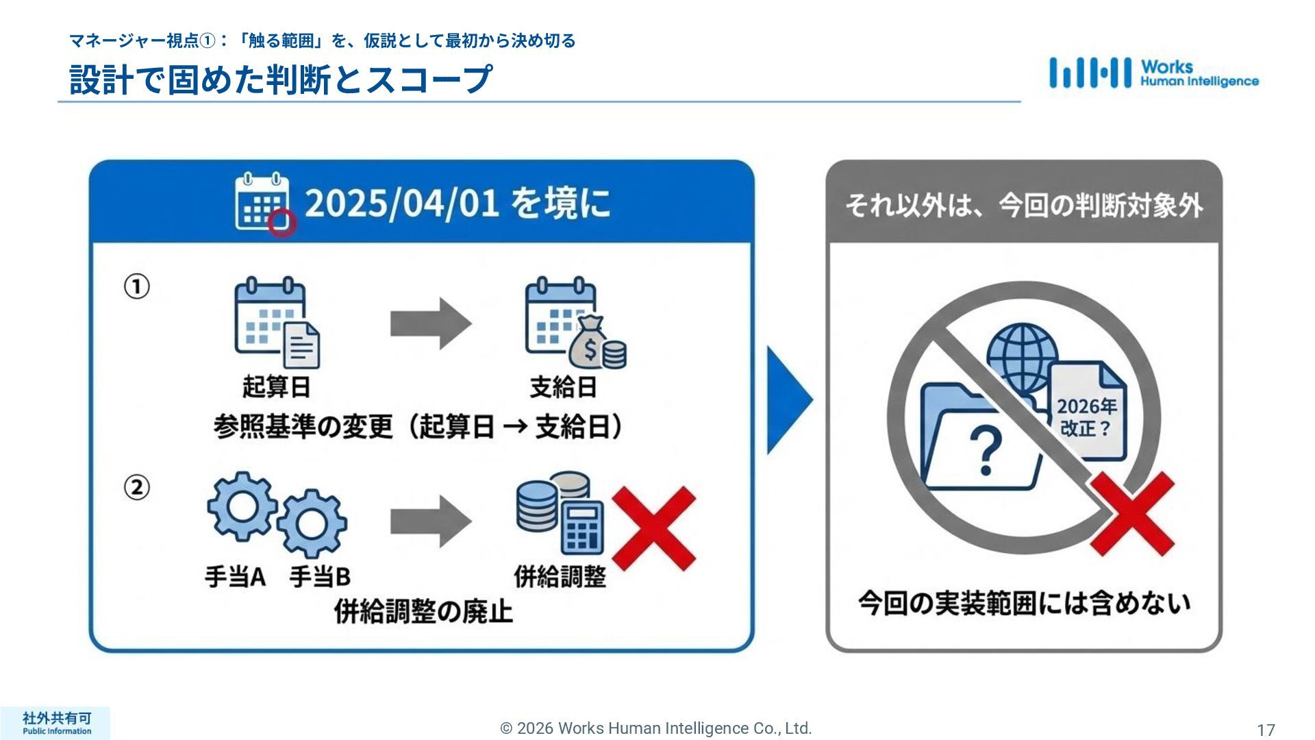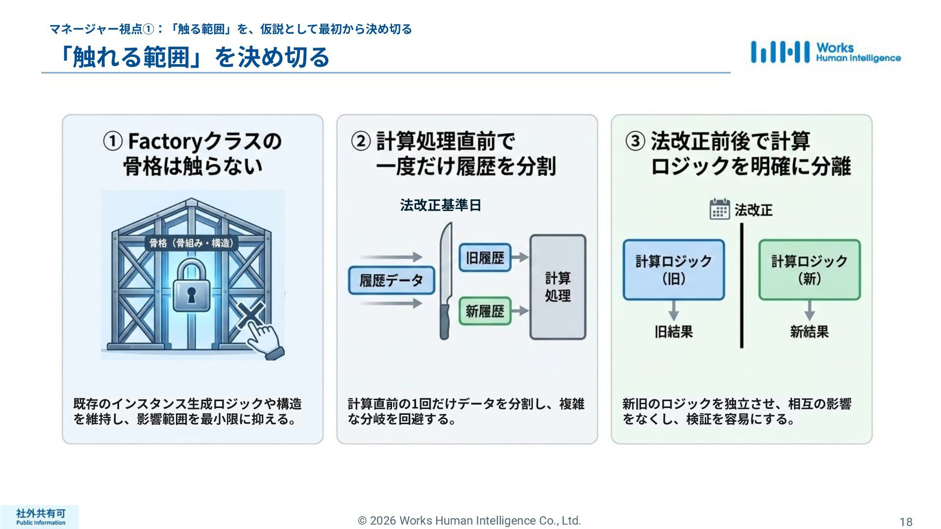 © 2026 Works Human Intelligence Co., Ltd. 17 設計で固めた判断とスコープ マネージャー視点①:「触る範囲」を、仮説として最初から決め切る