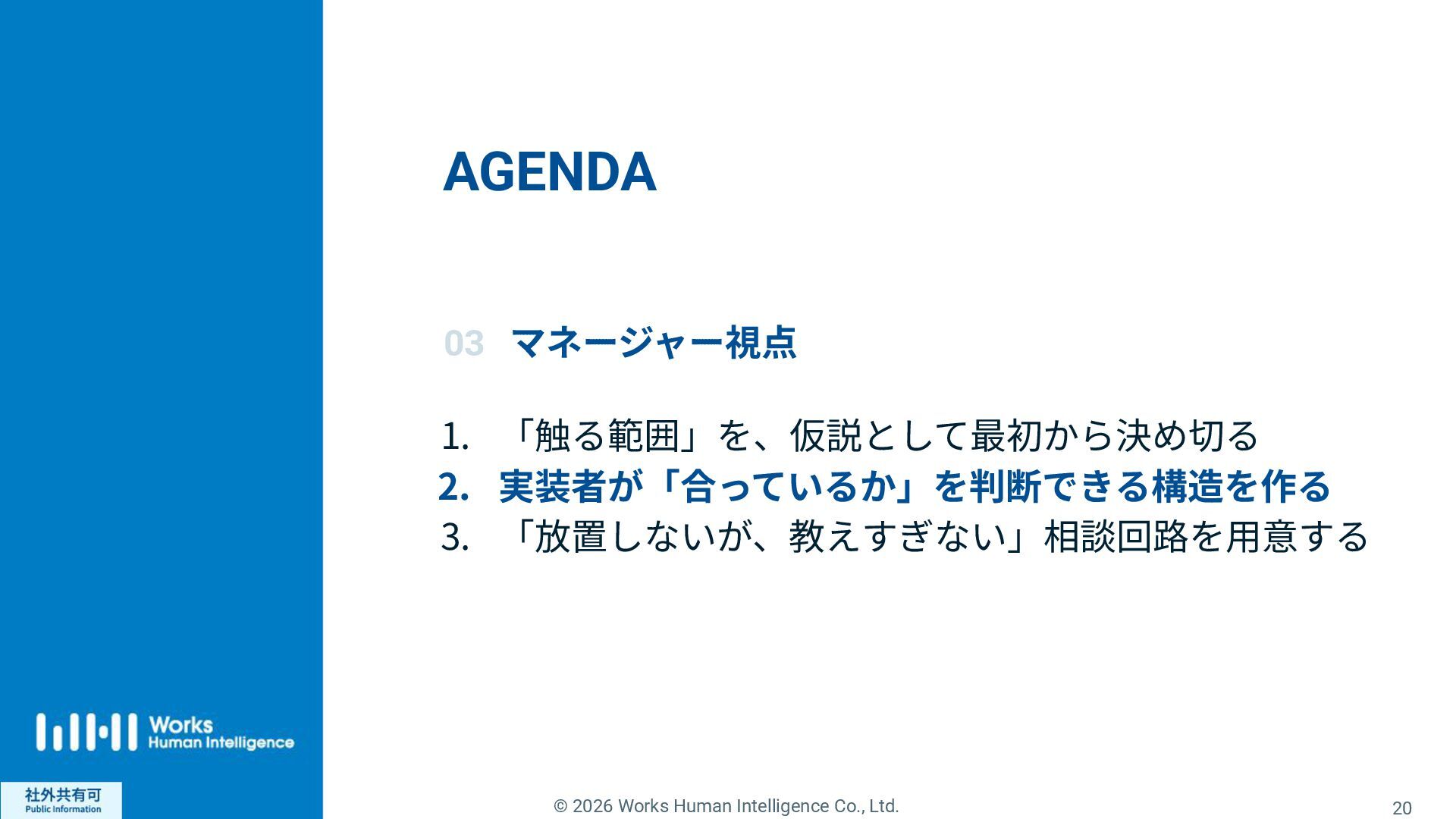 © 2026 Works Human Intelligence Co., Ltd. AGENDA 20 03 マネージャー視点