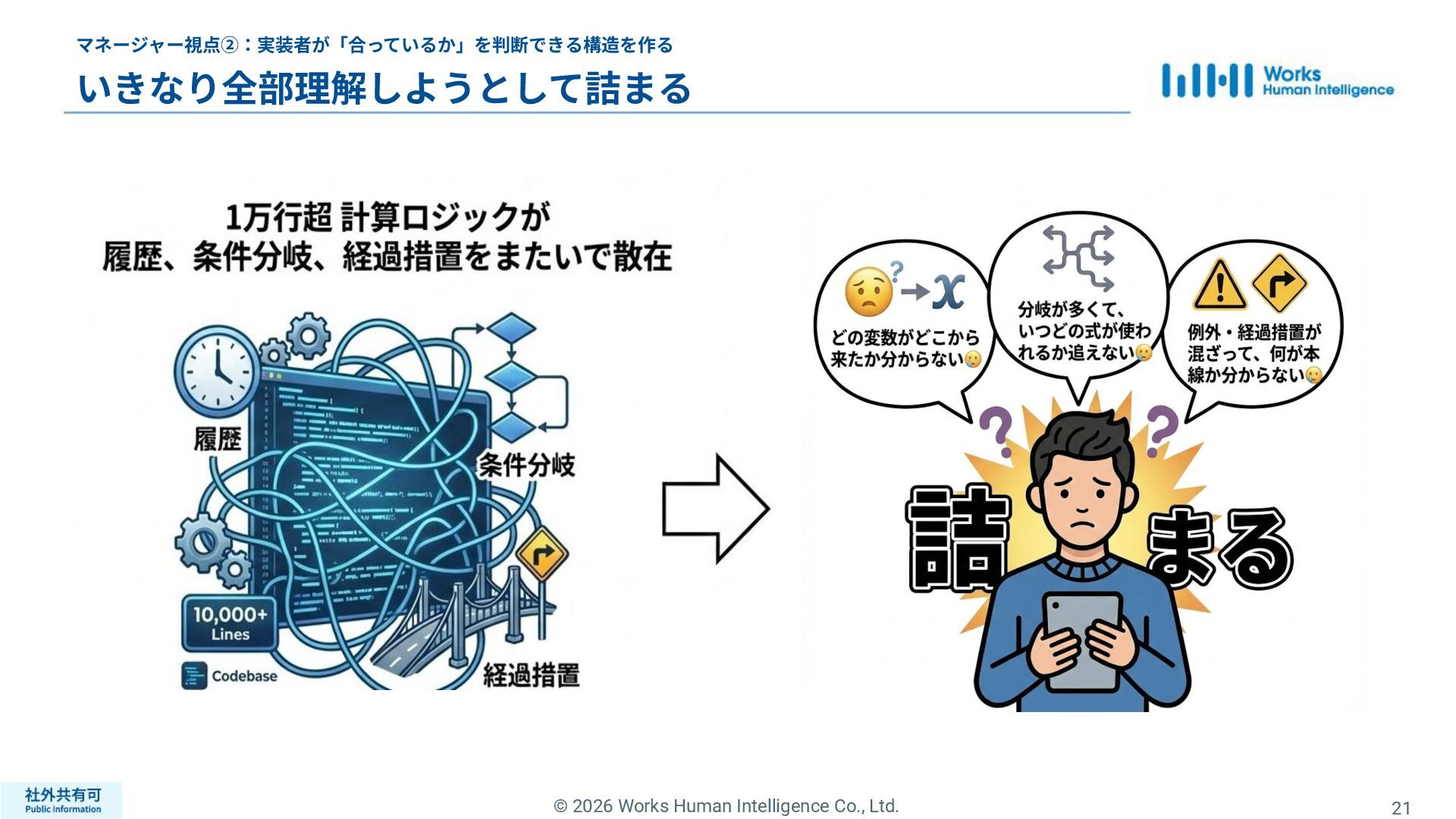 © 2026 Works Human Intelligence Co., Ltd. 21 いきなり全部理解しようとして詰まる マネージャー視点②:実装者が「合っているか」を判断できる構造を作る