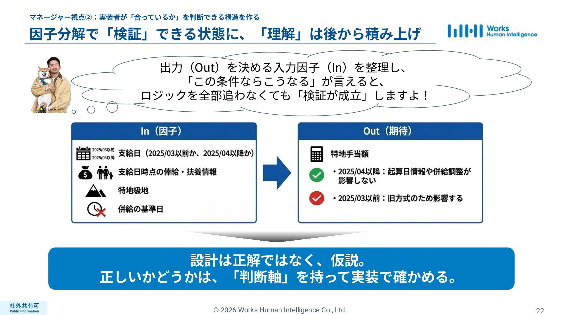© 2026 Works Human Intelligence Co., Ltd. 22 因⼦分解で「検証」できる状態に、「理解」は後から積み上げ マネージャー視点②:実装者が「合っているか」を判断できる構造を作る
