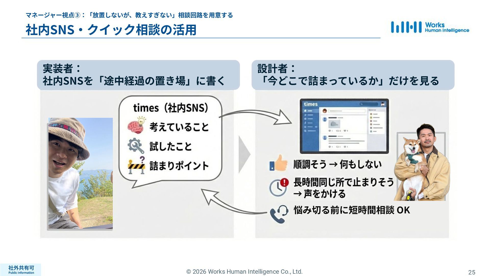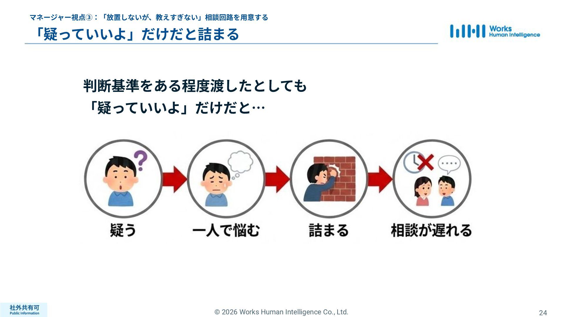 © 2026 Works Human Intelligence Co., Ltd. 24 「疑っていいよ」だけだと詰まる マネージャー視点③:「放置しないが、教えすぎない」相談回路を⽤意する