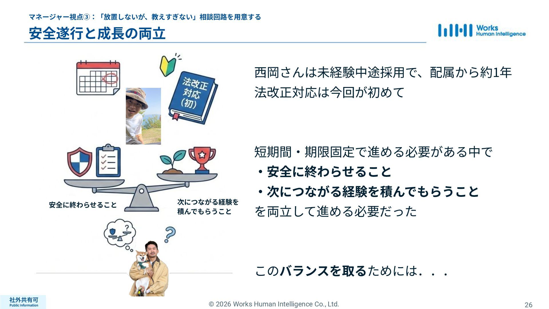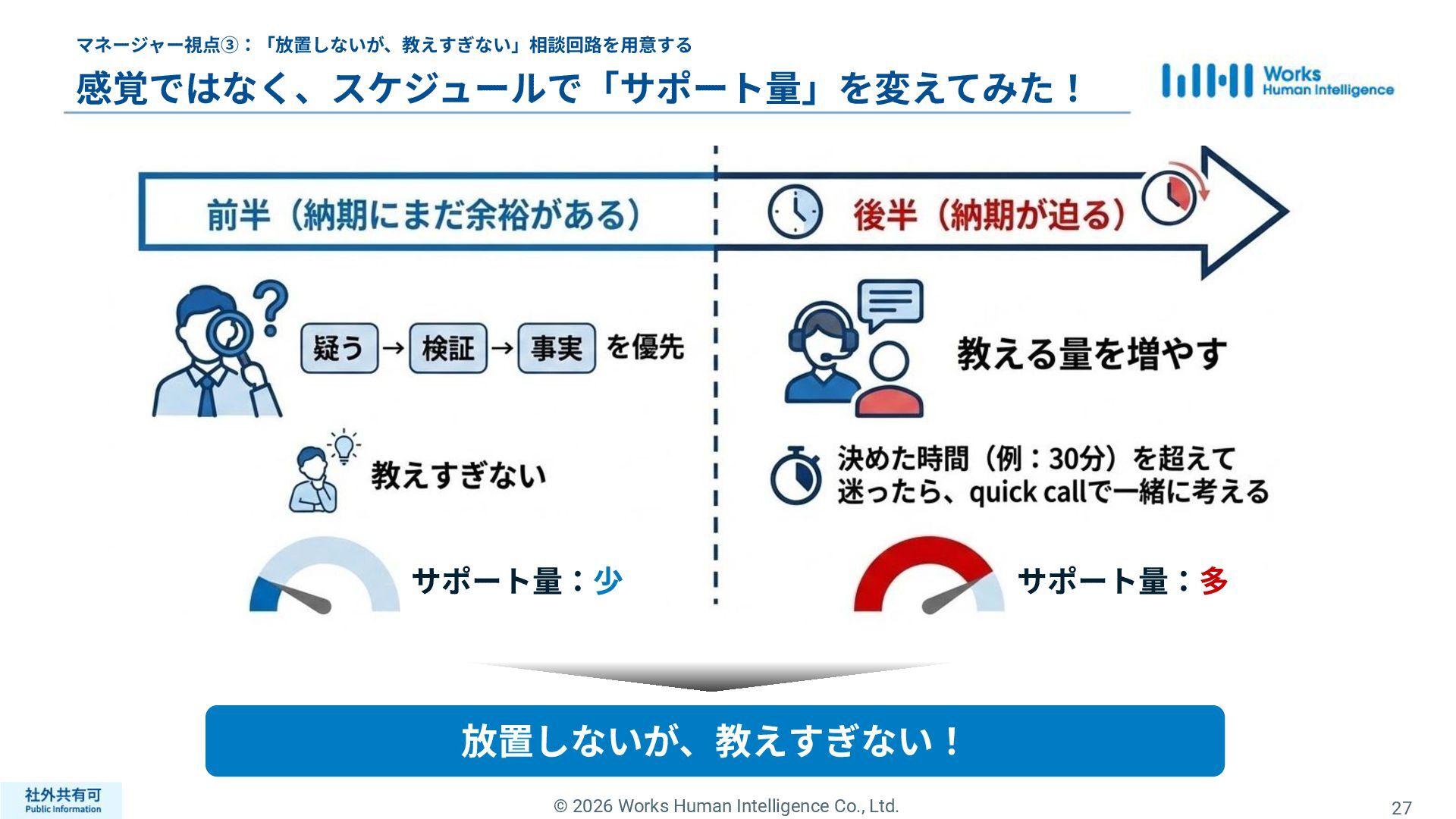 © 2026 Works Human Intelligence Co., Ltd. 26 安全遂⾏と成⻑の両⽴ マネージャー視点③:「放置しないが、教えすぎない」相談回路を⽤意する
