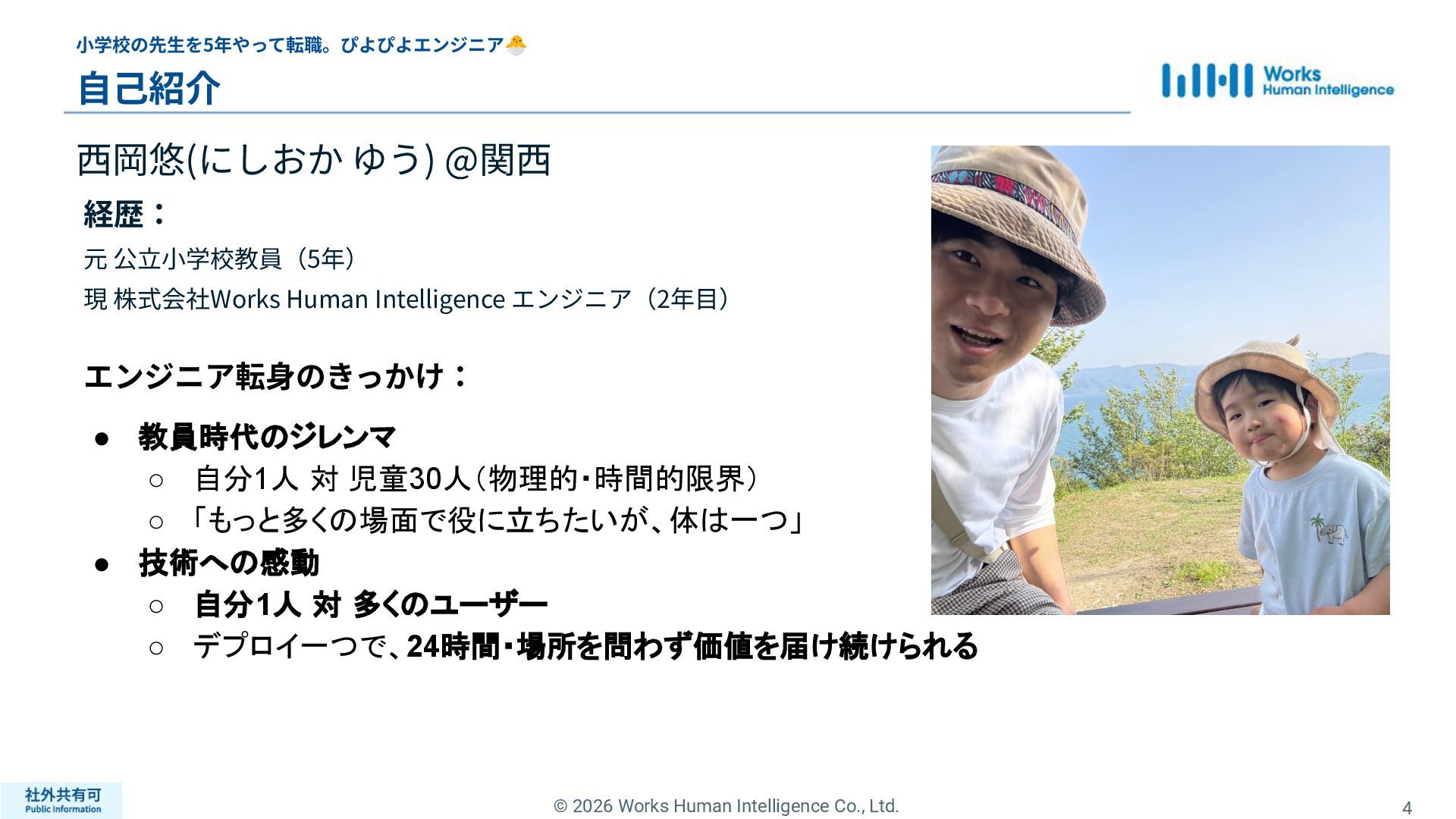 ゆう) @関⻄ ⼩学校の先⽣を5年やって転職。ぴよぴよエンジニア🐣 経歴: 元 公⽴⼩学校教員(5年) 現 株式会社Works Human Intelligence エンジニア(2年⽬) エンジニア転⾝のきっかけ: • 教員時代のジレンマ ◦ 自分1人 対 児童30人(物理的・時間的限界) ◦ 「もっと多くの場面で役に立ちたいが、体は一つ」 • 技術への感動 ◦ 自分1人 対 多くのユーザー ◦ デプロイ一つで、24時間・場所を問わず価値を届け続けられる