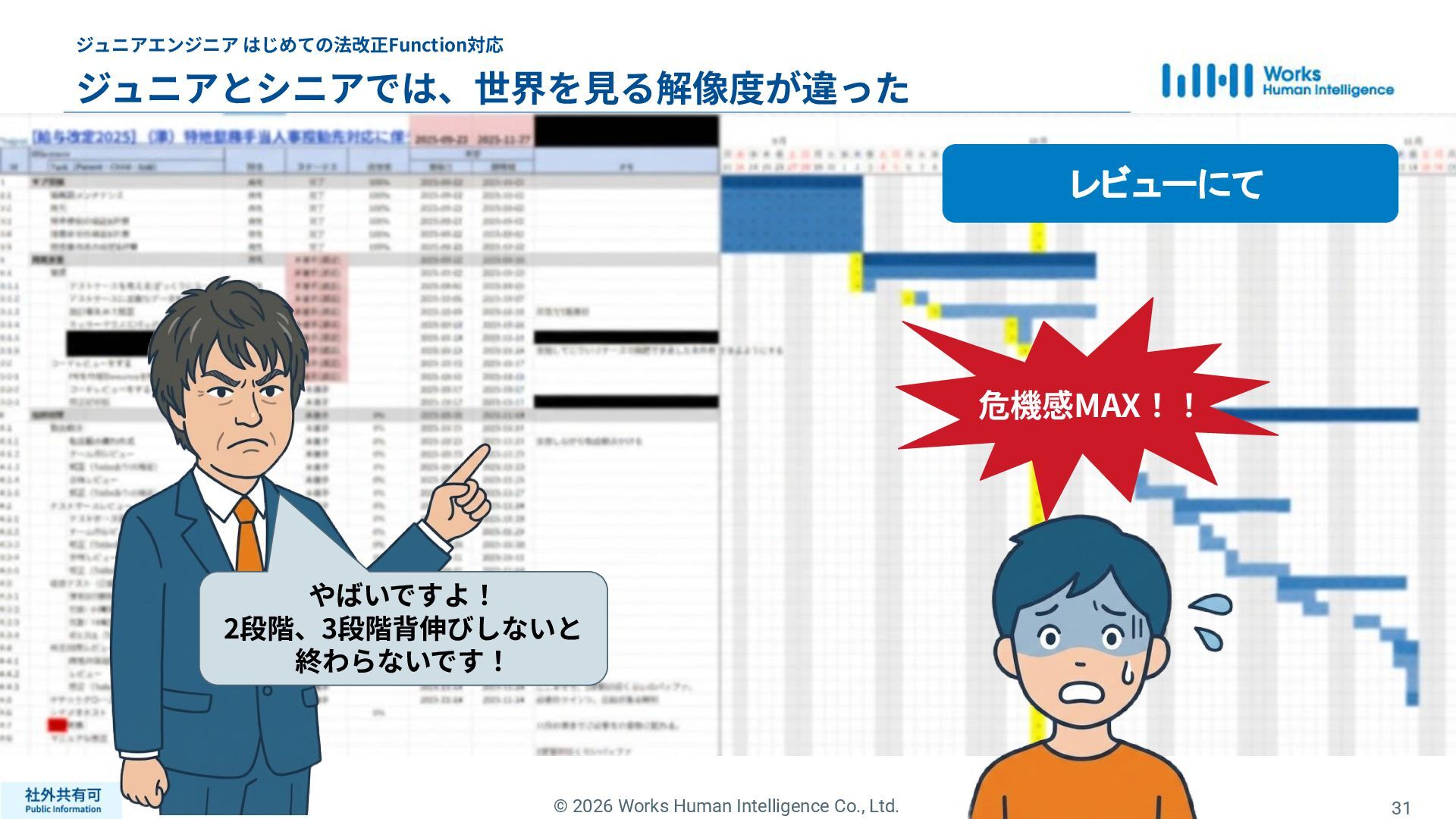 © 2026 Works Human Intelligence Co., Ltd. ジュニアエンジニア はじめての法改正Function対応 ジュニアとシニアでは、世界を⾒る解像度が違った