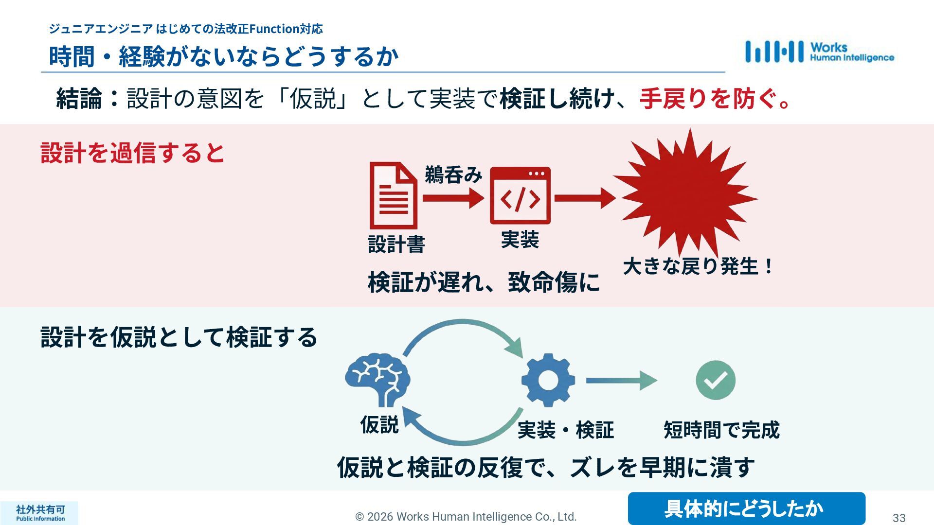 はじめての法改正Function対応 結論:設計の意図を「仮説」として実装で検証し続け、⼿戻りを防ぐ。 1. 設計を過信すると 設計を仮説として検証する 設計書 実装 鵜呑み ⼤きな戻り発⽣! 検証が遅れ、致命傷に 仮説 実装‧検証 短時間で完成 仮説と検証の反復で、ズレを早期に潰す 具体的にどうしたか