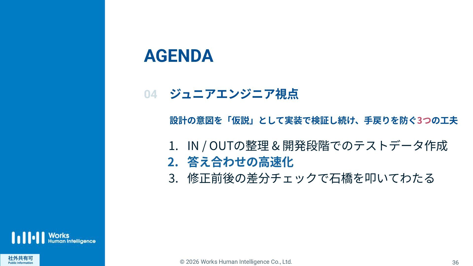 © 2026 Works Human Intelligence Co., Ltd. 35 開発段階でテストデータを作っておく ⼿戻りを減らす⼯夫①「IN