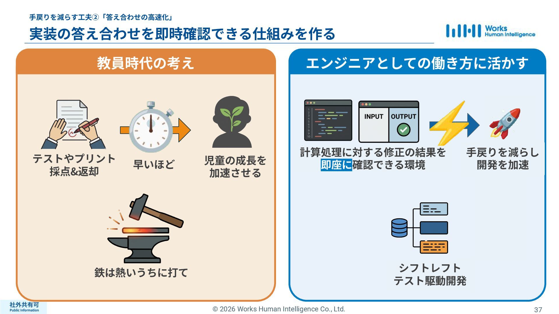 © 2026 Works Human Intelligence Co., Ltd. 教員時代の考え 37 実装の答え合わせを即時確認できる仕組みを作る