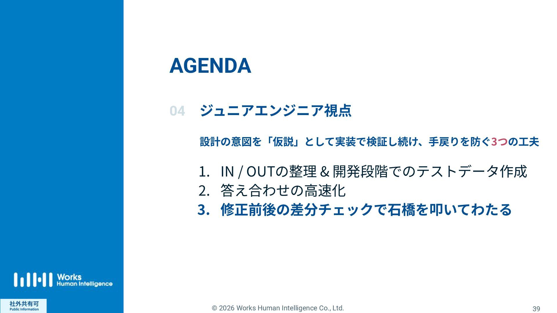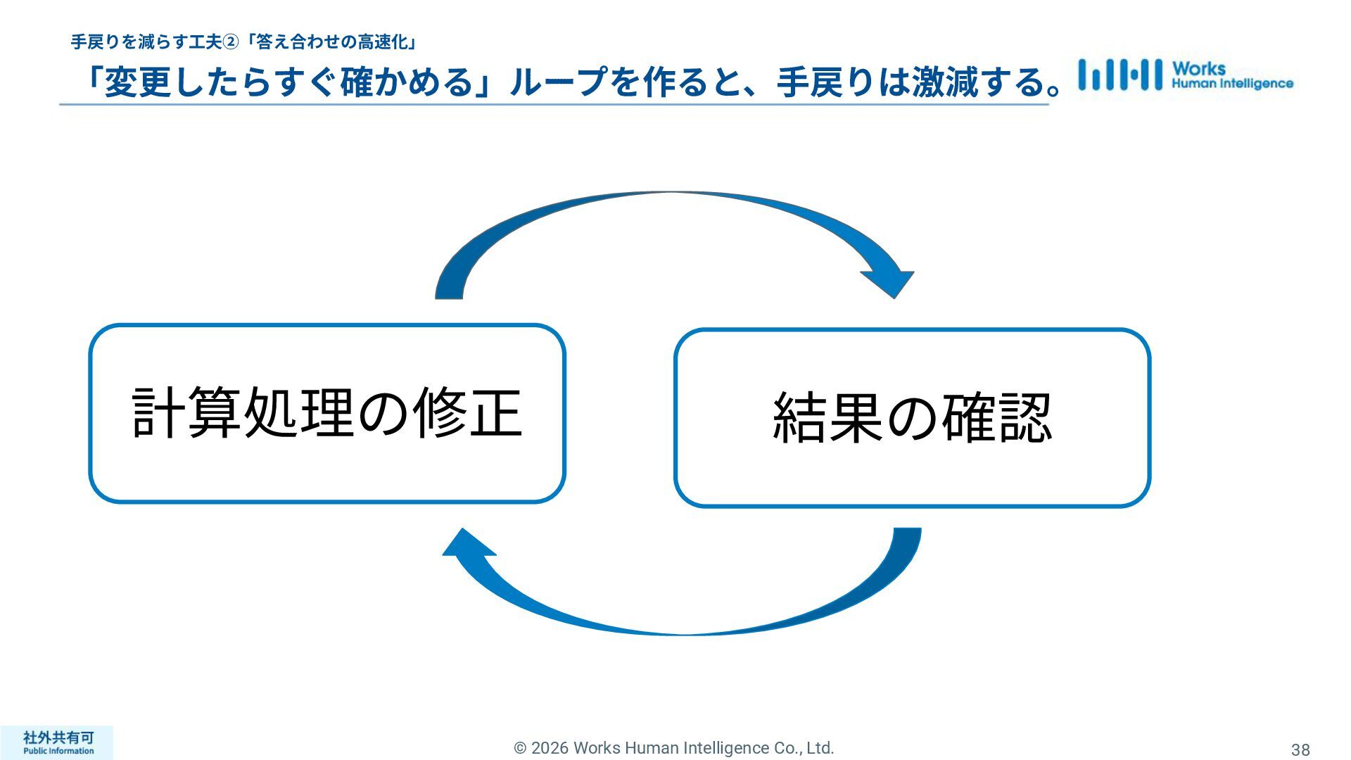 © 2026 Works Human Intelligence Co., Ltd. 38 「変更したらすぐ確かめる」ループを作ると、⼿戻りは激減する。 ⼿戻りを減らす⼯夫②「答え合わせの⾼速化」