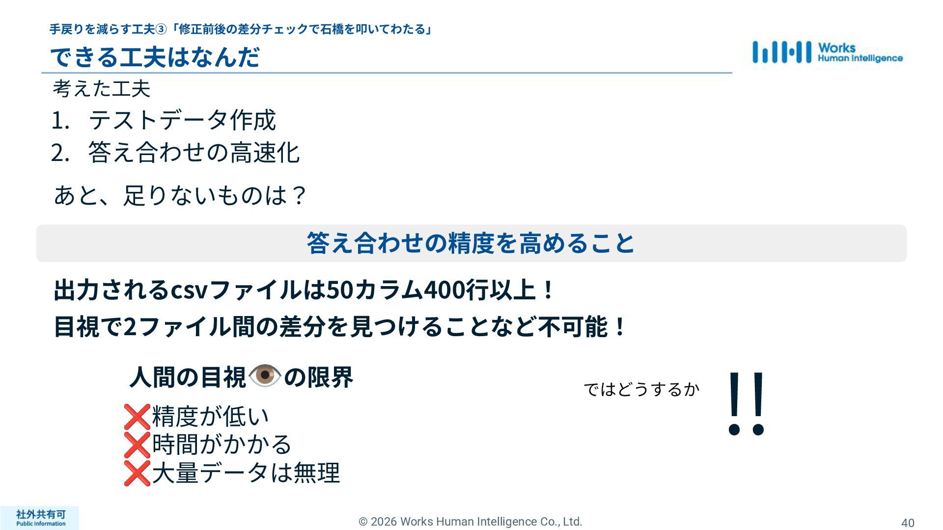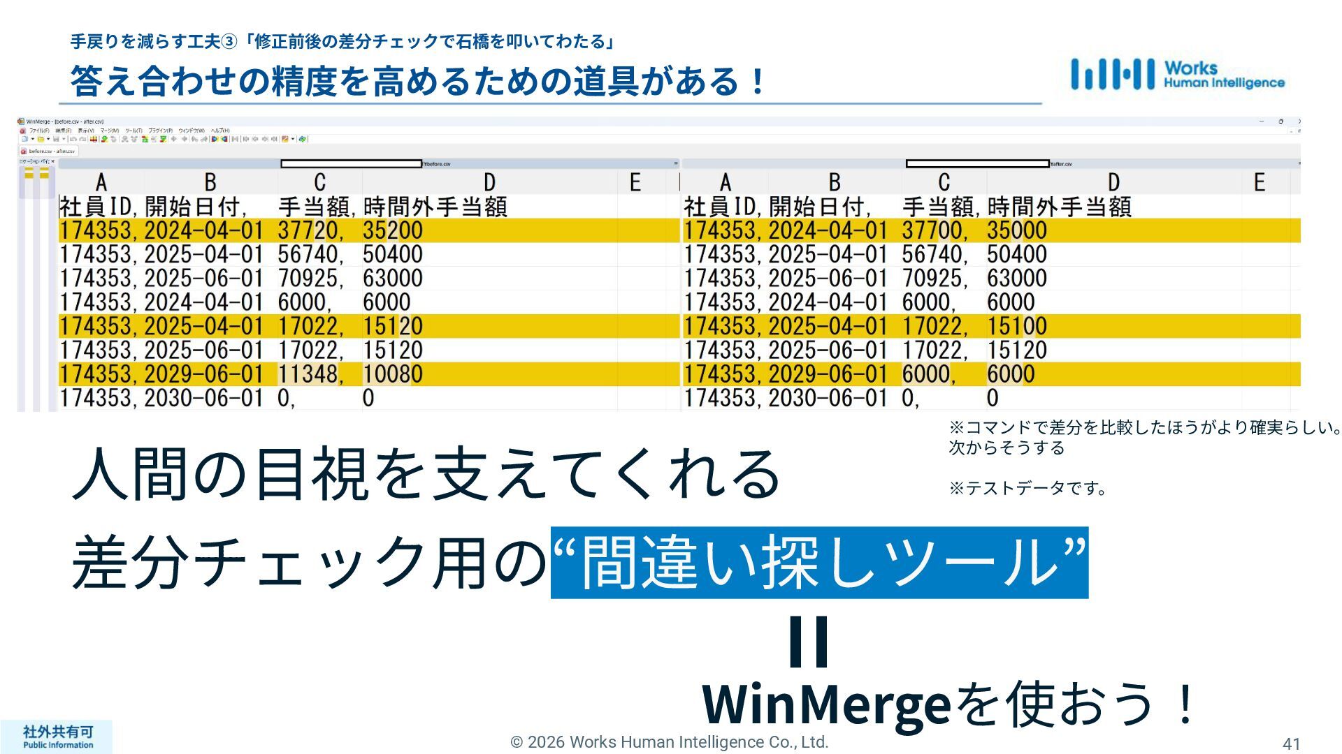 © 2026 Works Human Intelligence Co., Ltd. 40 できる⼯夫はなんだ ⼿戻りを減らす⼯夫③「修正前後の差分チェックで⽯橋を叩いてわたる」