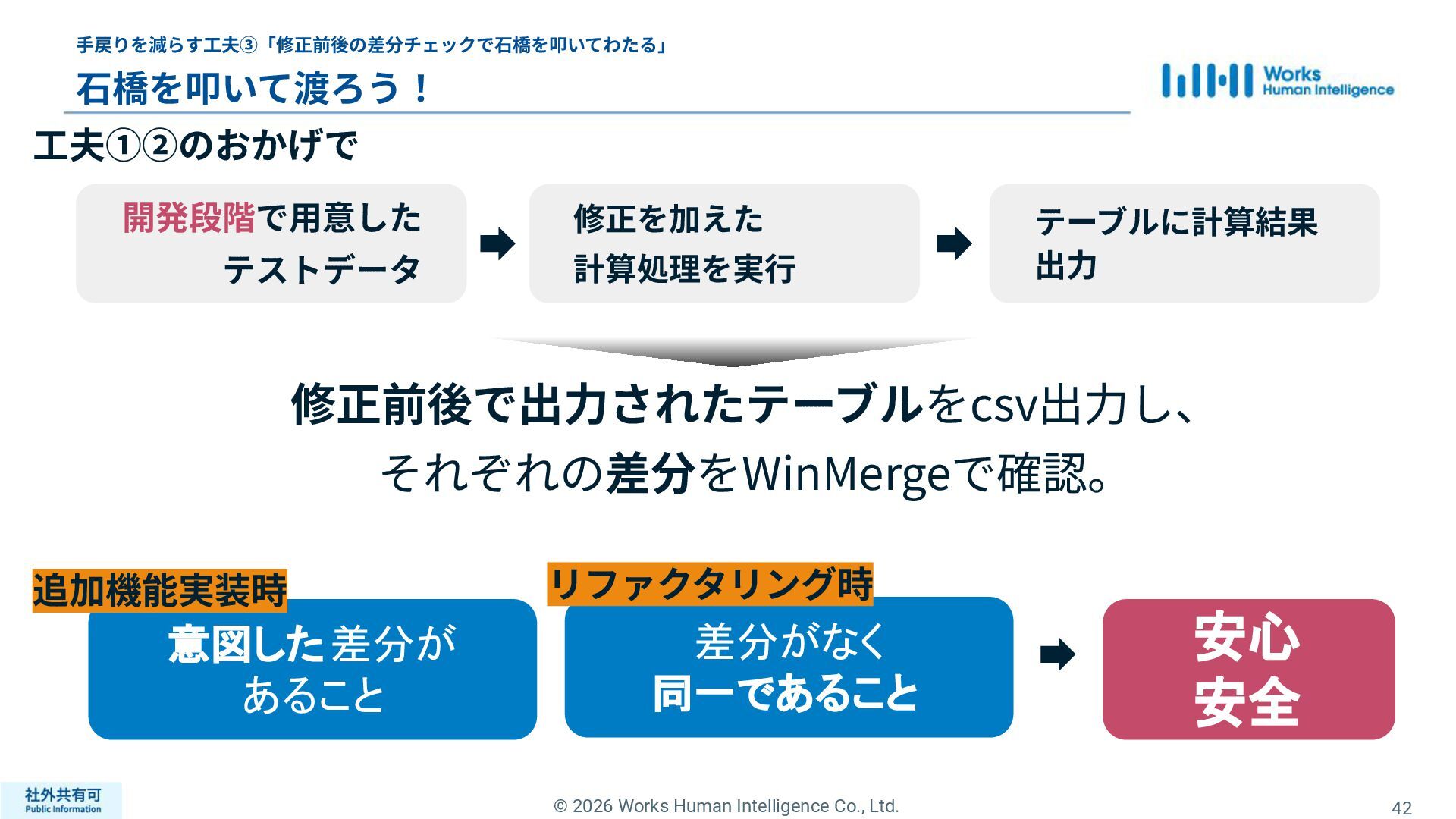 © 2026 Works Human Intelligence Co., Ltd. 41 答え合わせの精度を⾼めるための道具がある! ⼿戻りを減らす⼯夫③「修正前後の差分チェックで⽯橋を叩いてわたる」