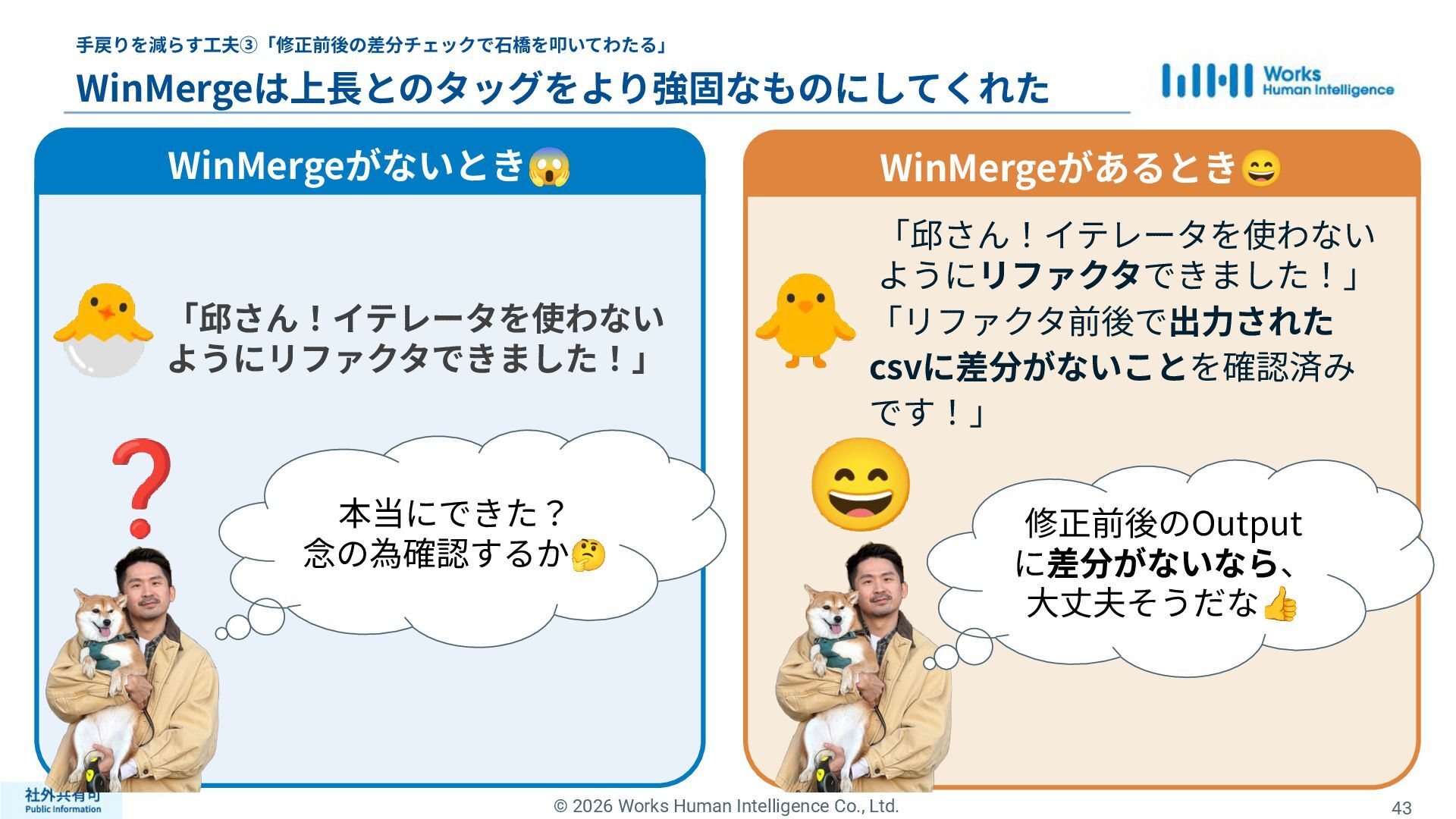 © 2026 Works Human Intelligence Co., Ltd. 43 WinMergeは上⻑とのタッグをより強固なものにしてくれた ⼿戻りを減らす⼯夫③「修正前後の差分チェックで⽯橋を叩いてわたる」