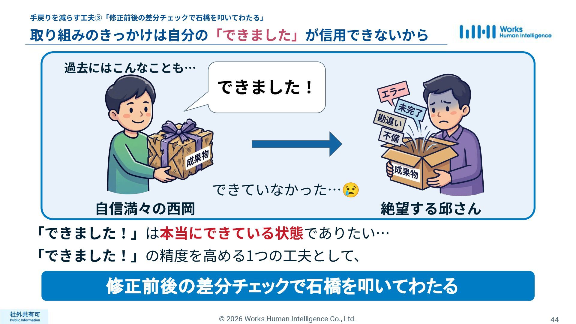 © 2026 Works Human Intelligence Co., Ltd. 44 取り組みのきっかけは⾃分の「できました」が信⽤できないから ⼿戻りを減らす⼯夫③「修正前後の差分チェックで⽯橋を叩いてわたる」