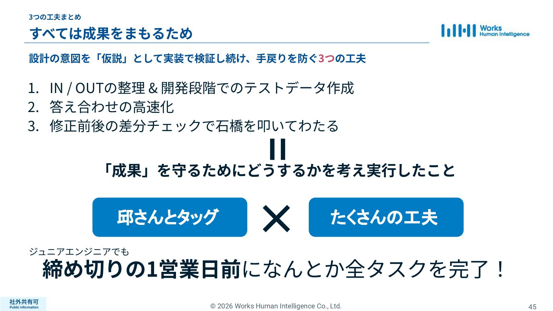 © 2026 Works Human Intelligence Co., Ltd. 3つの⼯夫まとめ すべては成果をまもるため 設計の意図を「仮説」として実装で検証し続け、⼿戻りを防ぐ3つの⼯夫