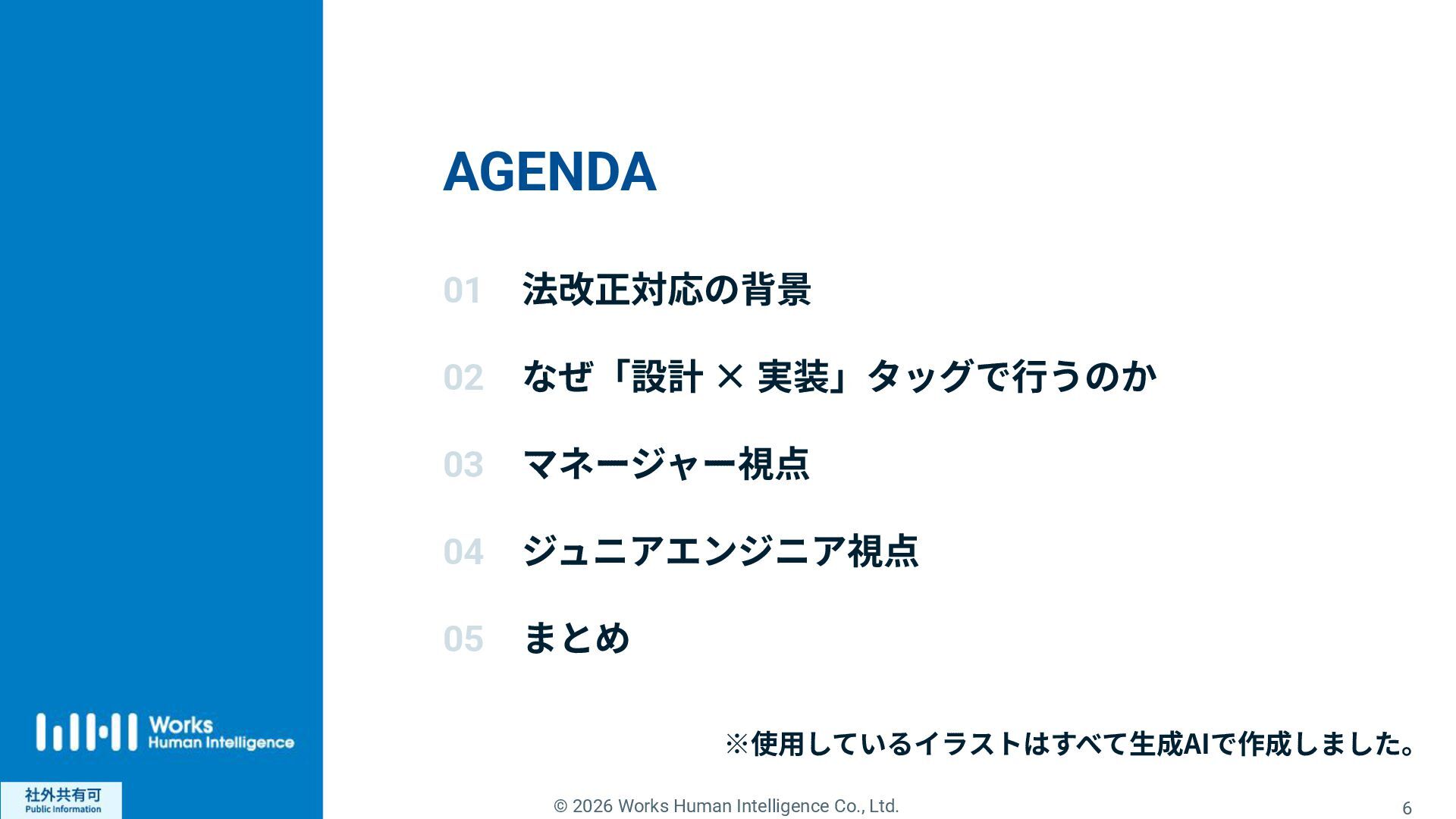 02 03 04 05 法改正対応の背景 なぜ「設計 × 実装」タッグで⾏うのか マネージャー視点 ジュニアエンジニア視点 まとめ ※使⽤しているイラストはすべて⽣成AIで作成しました。
