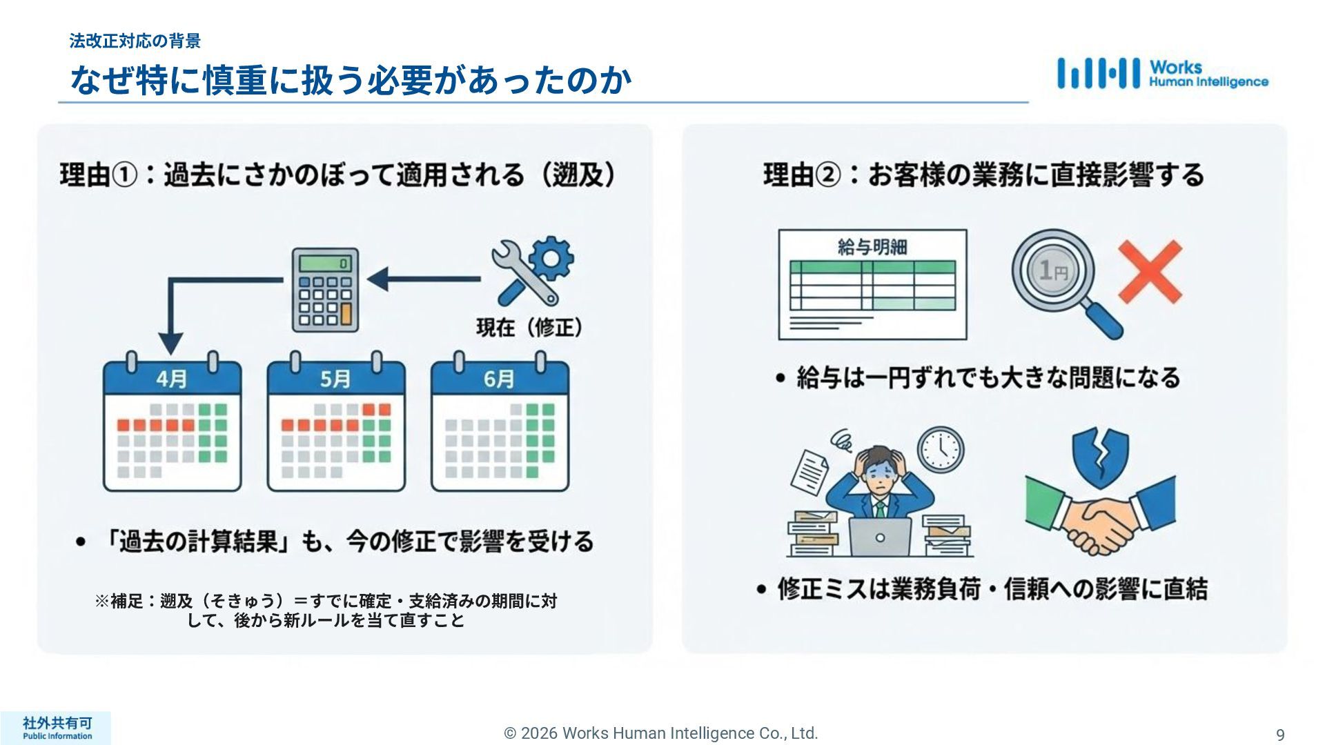 © 2026 Works Human Intelligence Co., Ltd. 8 今回の法改正対応の概要 法改正対応の背景