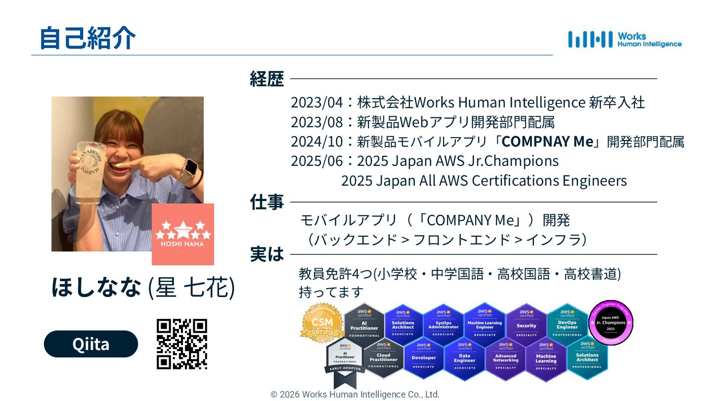 教員免許4つ(⼩学校‧中学国語‧⾼校国語‧⾼校書道) 持ってます 2023/04:株式会社Works Human Intelligence 新卒⼊社 2023/08:新製品Webアプリ開発部⾨配属 2024/10:新製品モバイルアプリ「COMPNAY Me」開発部⾨配属 2025/06:2025 Japan AWS Jr.Champions 2025 Japan All AWS Certifications Engineers 仕事 モバイルアプリ(「COMPANY Me」)開発 (バックエンド > フロントエンド > インフラ) ほしなな (星 七花) Qiita