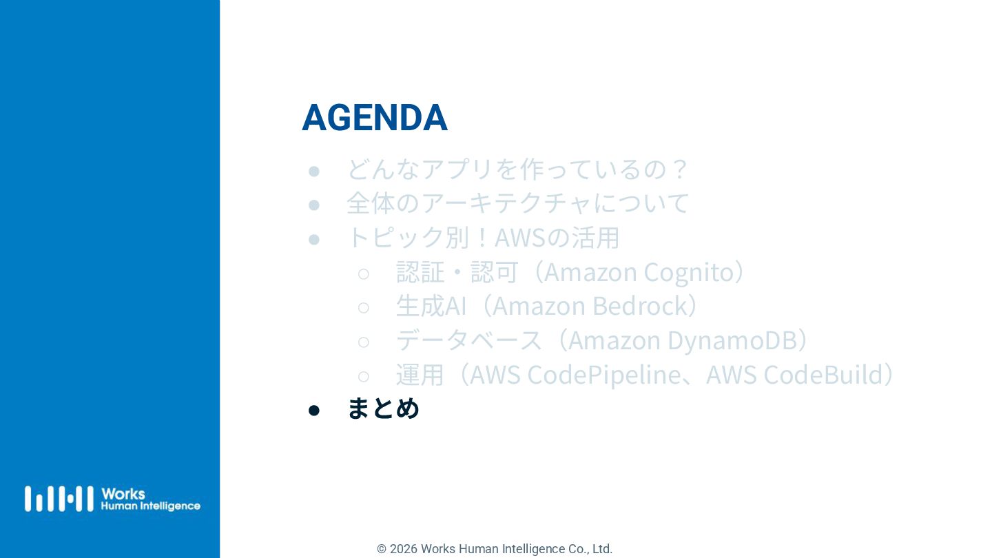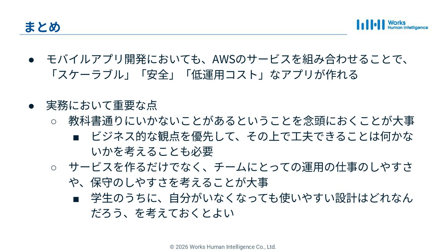 © 2026 Works Human Intelligence Co., Ltd. まとめ • モバイルアプリ開発においても、AWSのサービスを組み合わせることで、