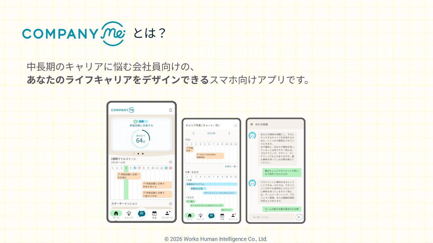 © 2026 Works Human Intelligence Co., Ltd. とは? 中⻑期のキャリアに悩む会社員向けの、 あなたのライフキャリアをデザインできるスマホ向けアプリです。